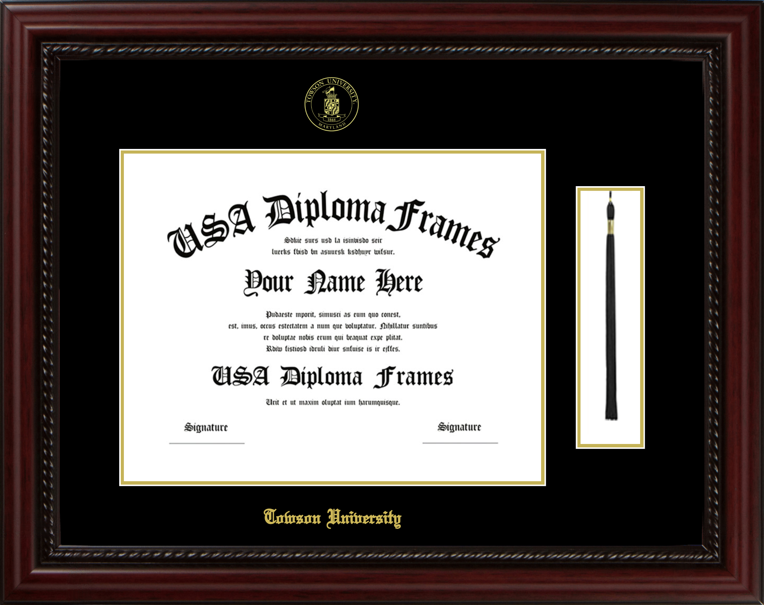 Towson University Diploma Frame with Tassel – Executive Cherry Rope – Black and Gold Mat