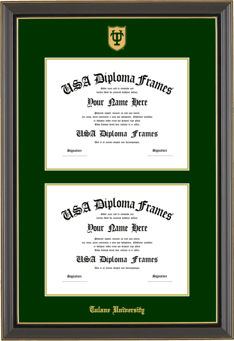 Tulane University Double Diploma Frame – Double Document – Black Gold Trim Glossy – Winter Green and Gold Mat