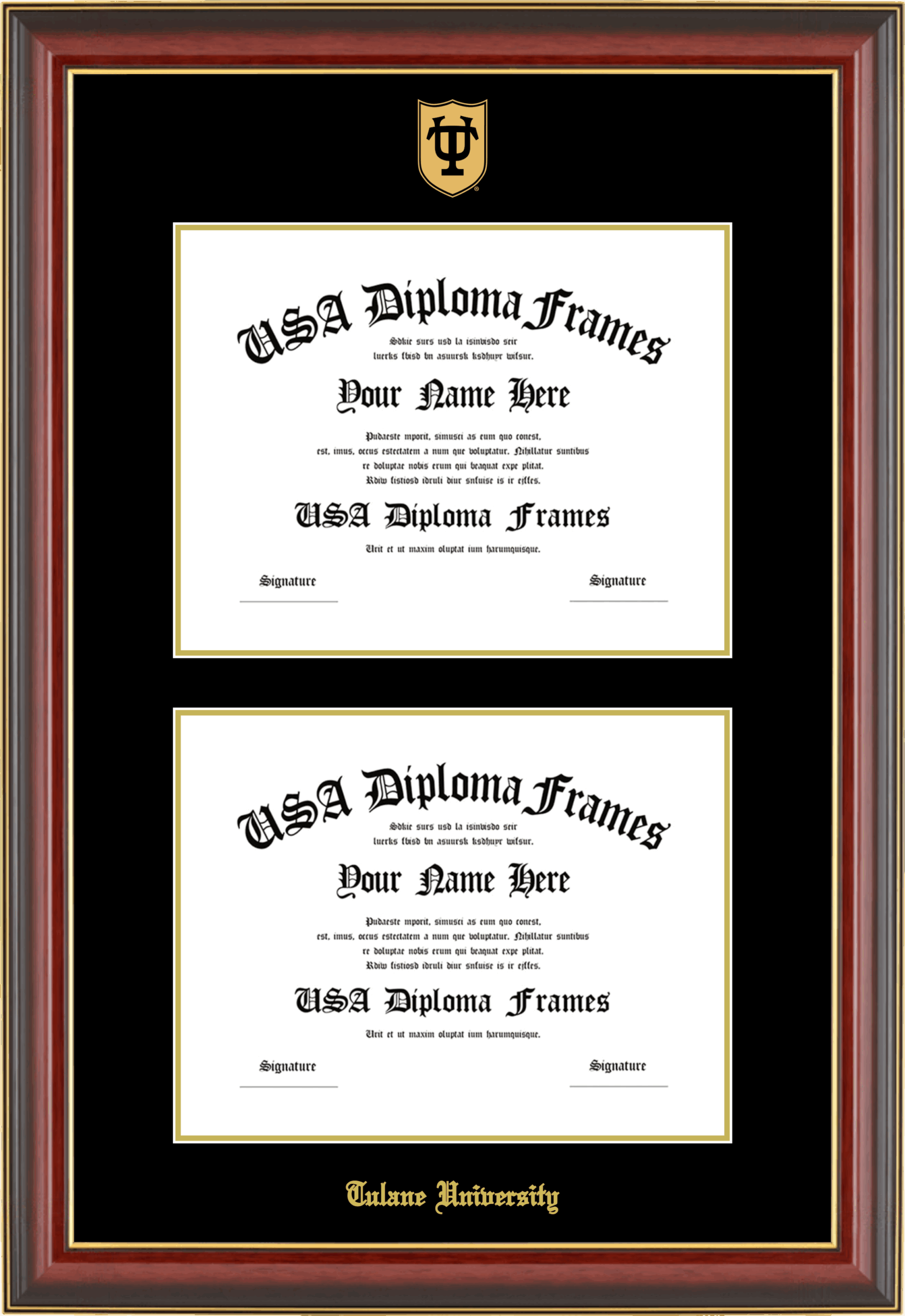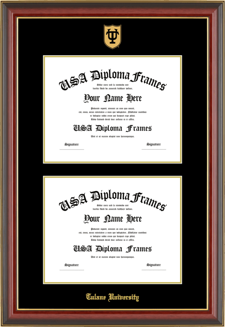 Tulane University Double Diploma Frame – Double Document – Cherry Mahogany Gold Trim Glossy – Black and Gold Mat