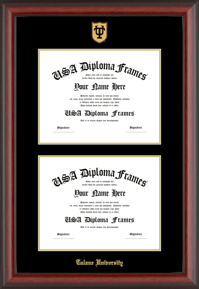 Tulane University Double Diploma Frame – Double Document – Cherry Mahogany Matte – Black and Gold Mat