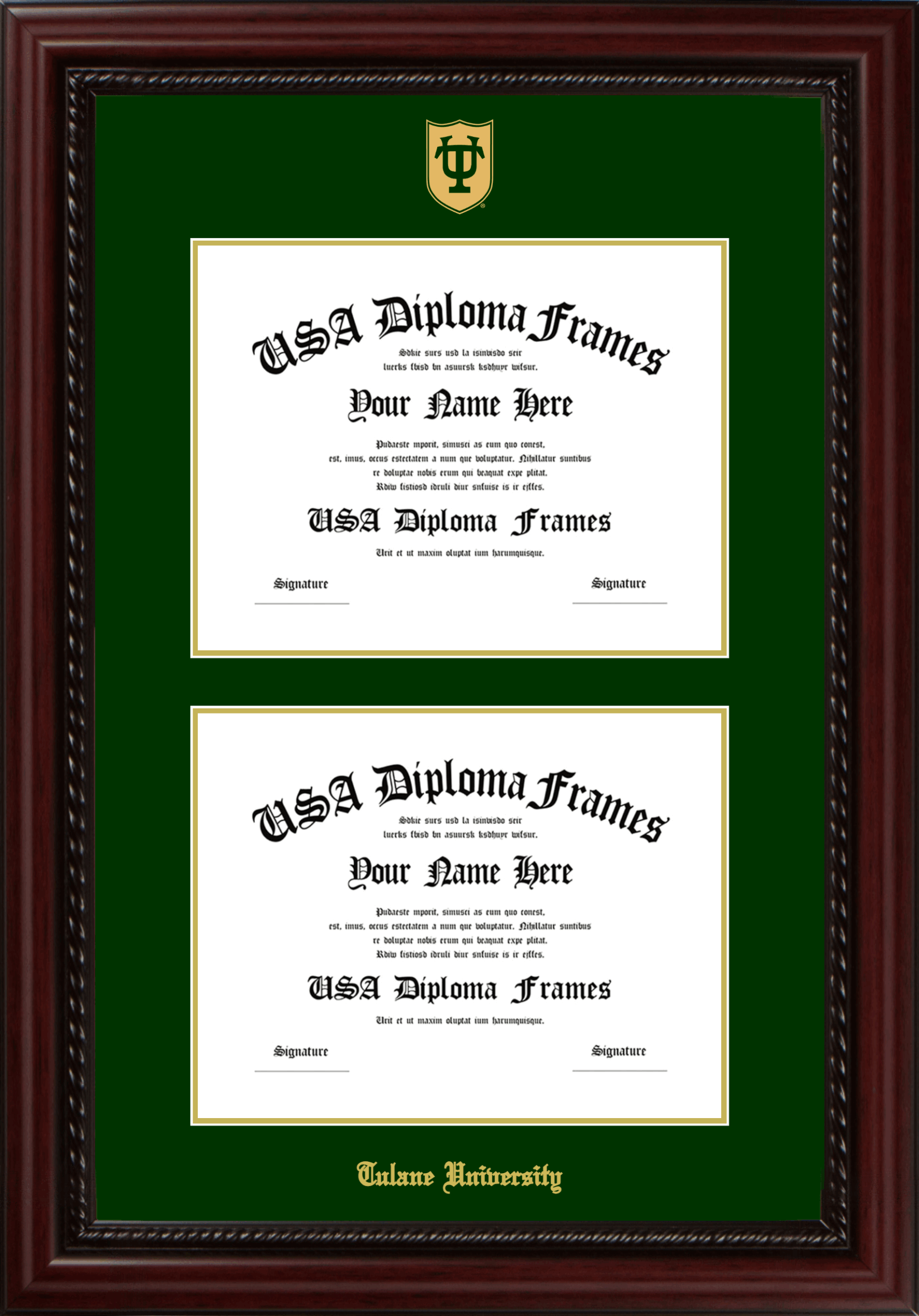 Tulane University – Double Document Double Diploma Frame – Executive Cherry Rope – Winter Green and Gold Mat