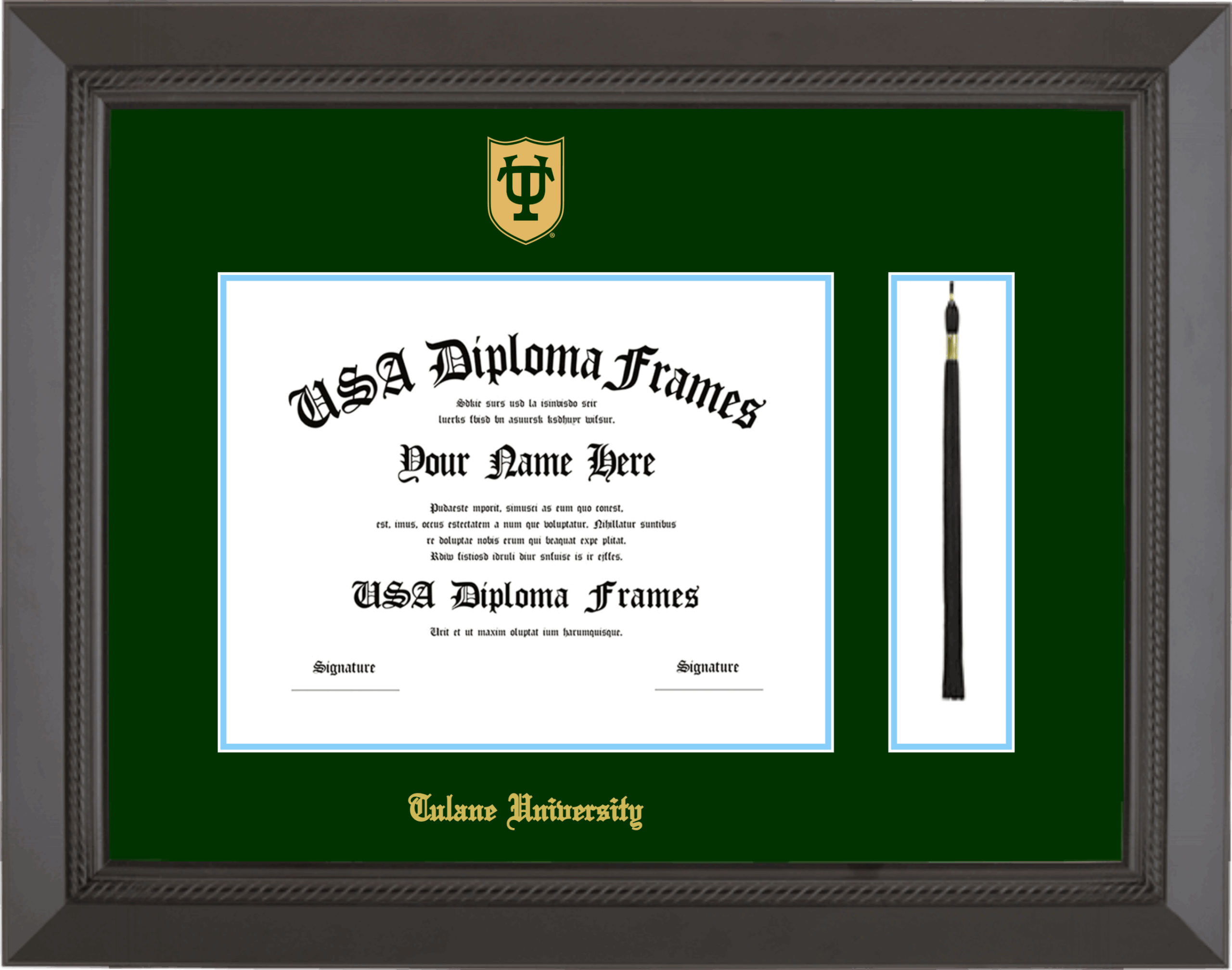 Tulane University Diploma Frame with Tassel – Black Rope – Winter Green and Light Blue Mat