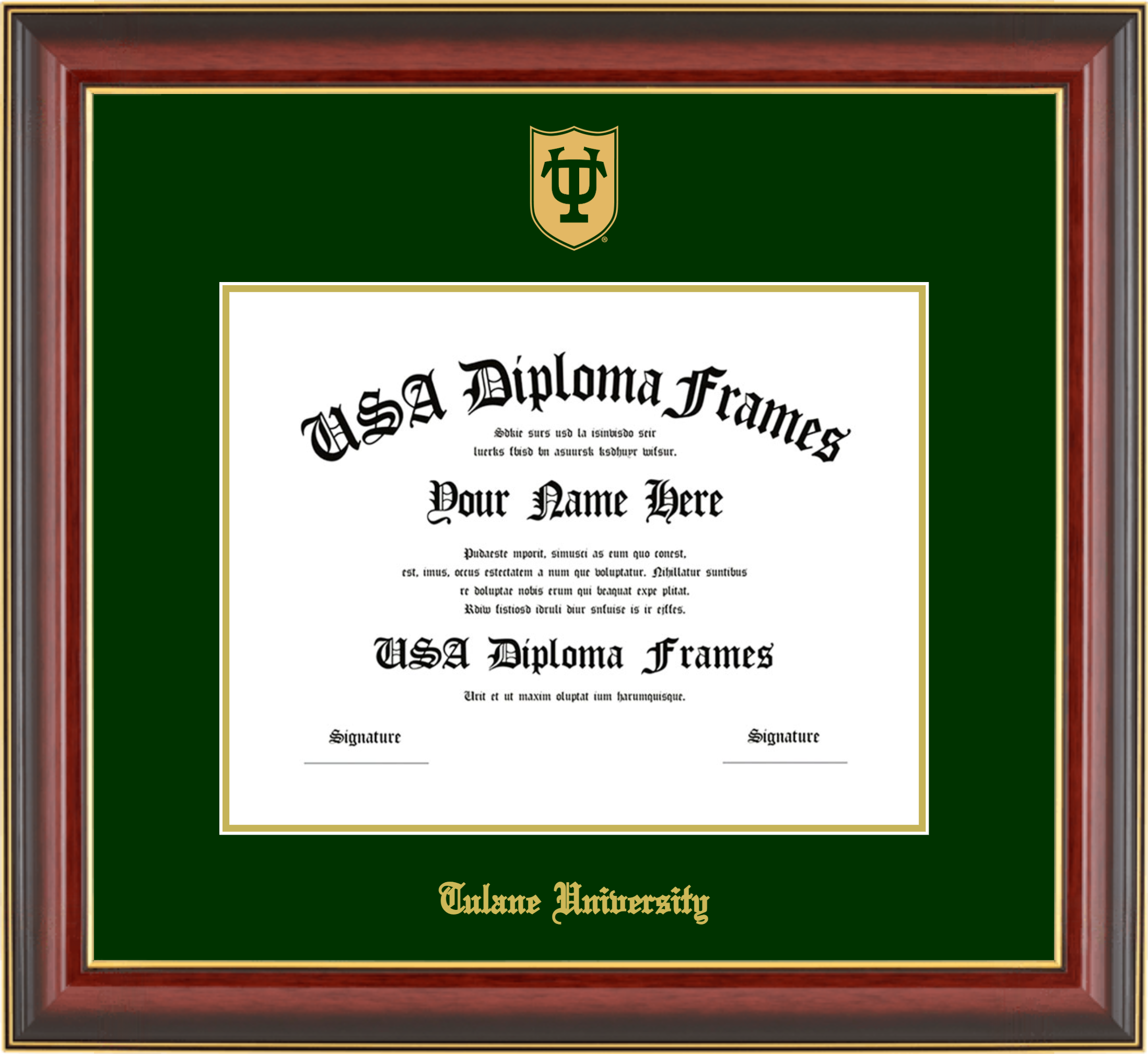 Tulane University Diploma Frame- Cherry Mahogany Gold Trim Glossy – Winter Green and Gold Mat