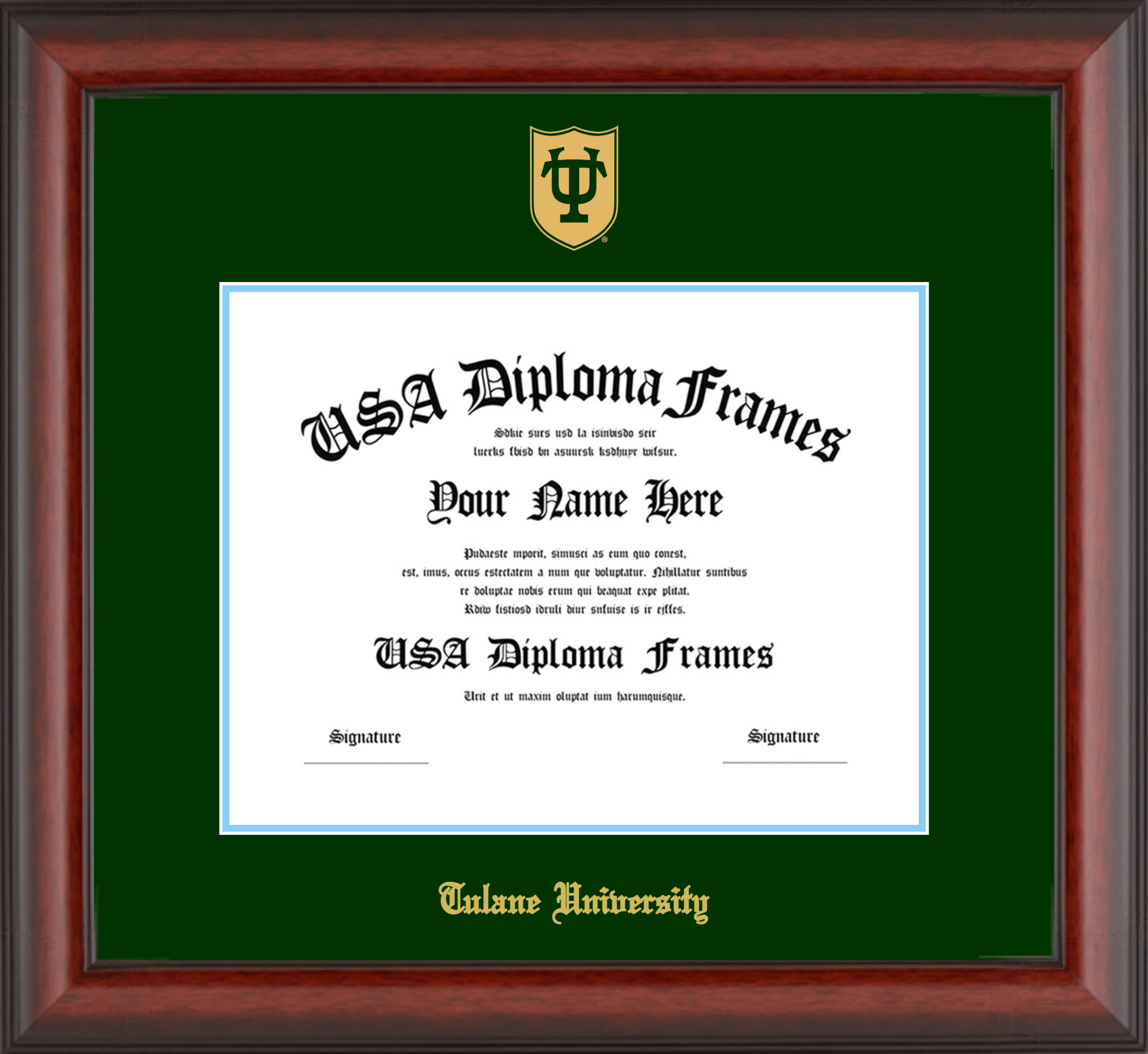 Tulane University Diploma Frame – Cherry Mahogany Matte – Winter Green and Light Blue Mat