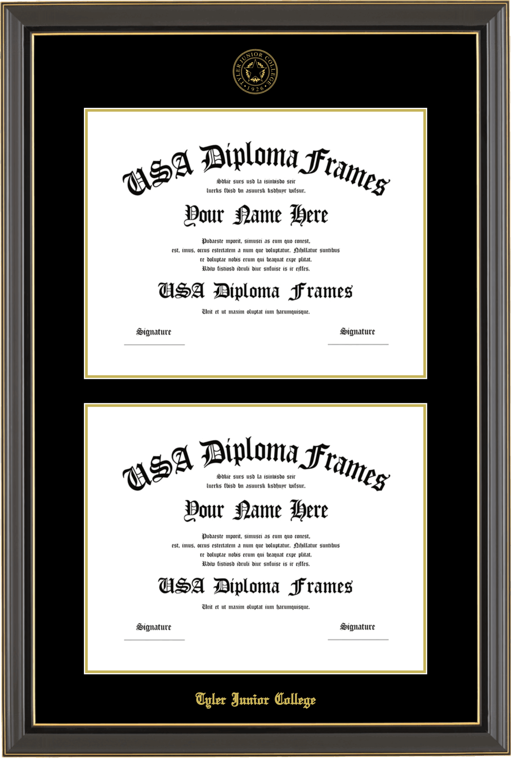 Tyler Junior College Double Diploma Frame – Double Document for Bachelor’s Degrees – Black Gold Trim Glossy – Black and Gold Mat