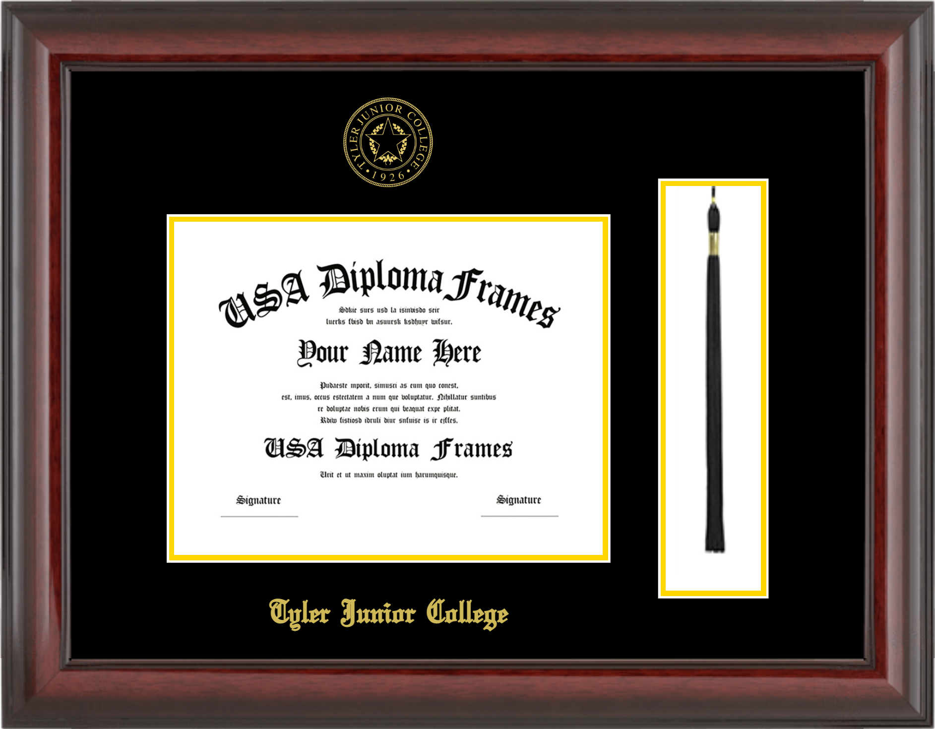 Tyler Junior College Diploma Frame with Tassel – Associates 7×9 – Cherry Mahogany Glossy – Black and Yellow Gold Mat