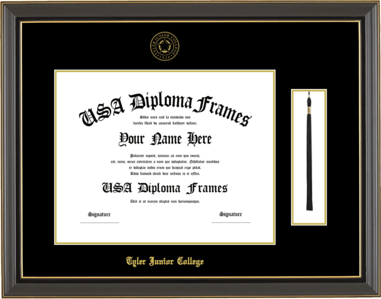 Tyler Junior College Diploma Frame with Tassel – Black Gold Trim Glossy – Black and Gold Mat