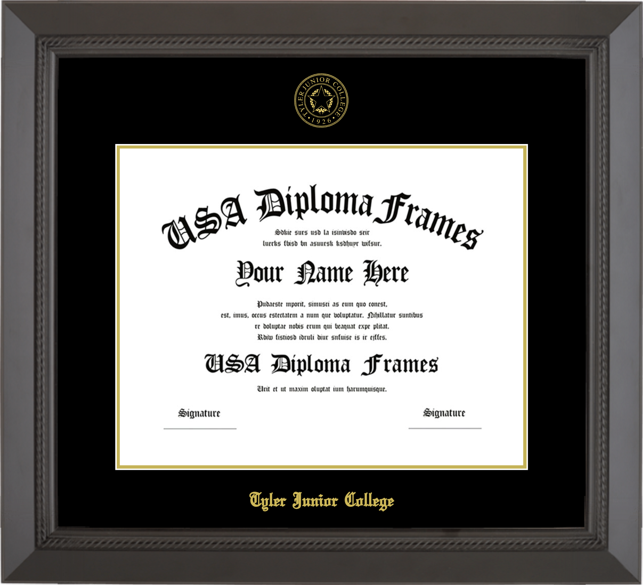 Tyler Junior College Diploma Frame – Black Rope – Black and Gold Mat – 11×14