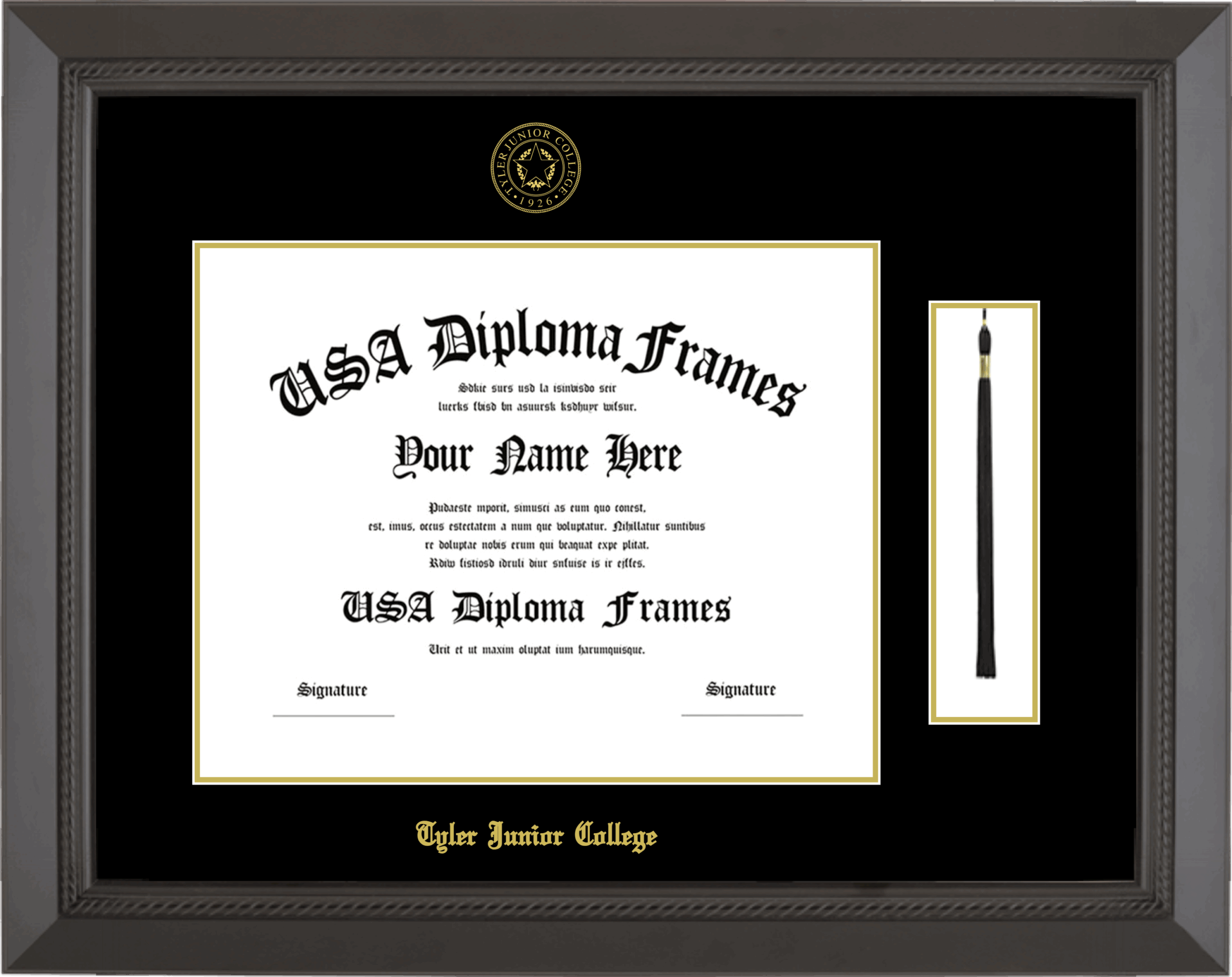 Tyler Junior College – Single Horizontal Document ( Bachelors ) – Black Rope – Black Mat – Gold Accent Mat – With Tassel(Default) – With Seal(University Seal Gold) – With Gold Embossing (Tyler Junior College)
