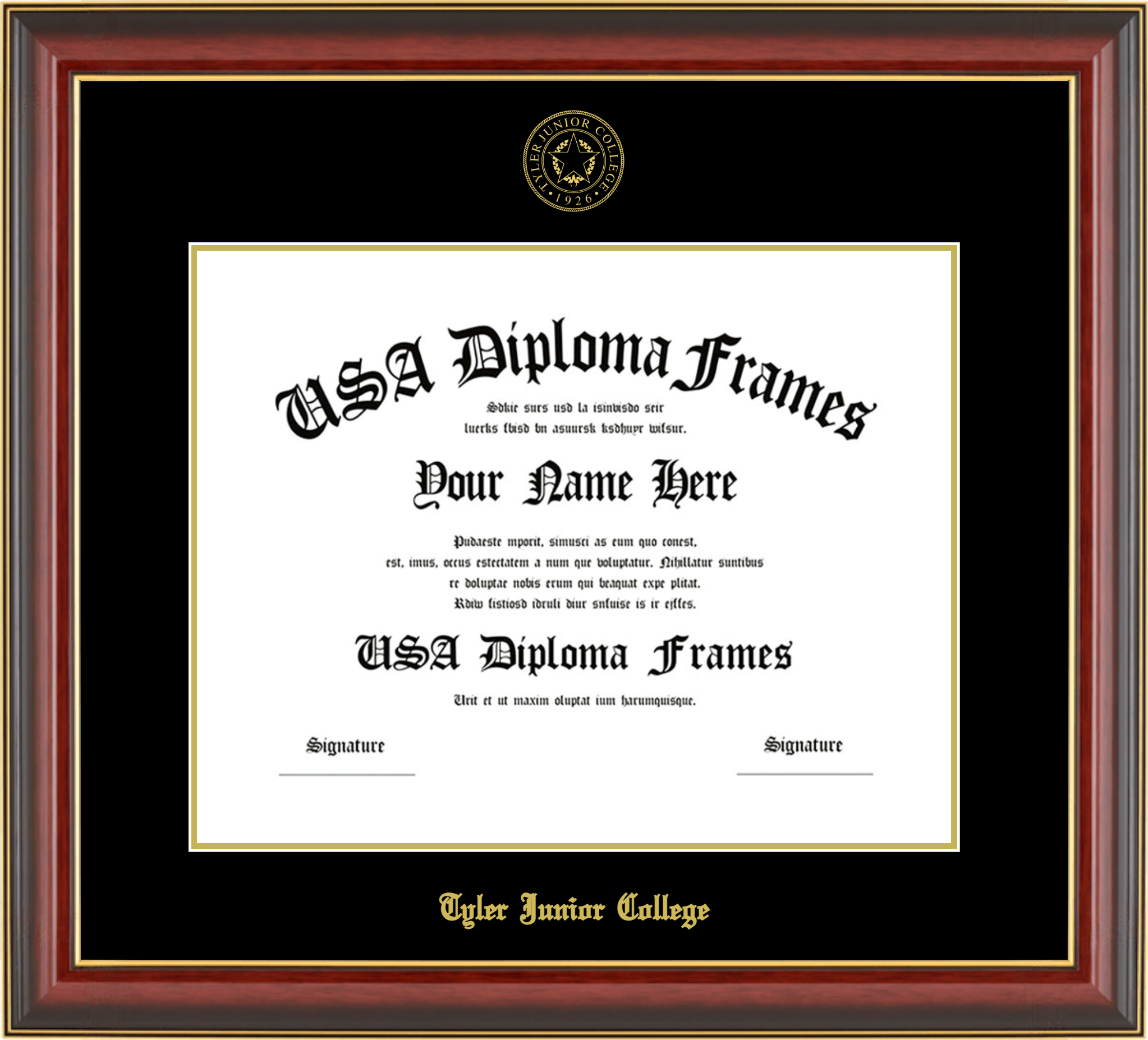 Tyler Junior College Diploma Frame – Cherry Mahogany Gold Trim Glossy – Black and Gold Mat – 11×14