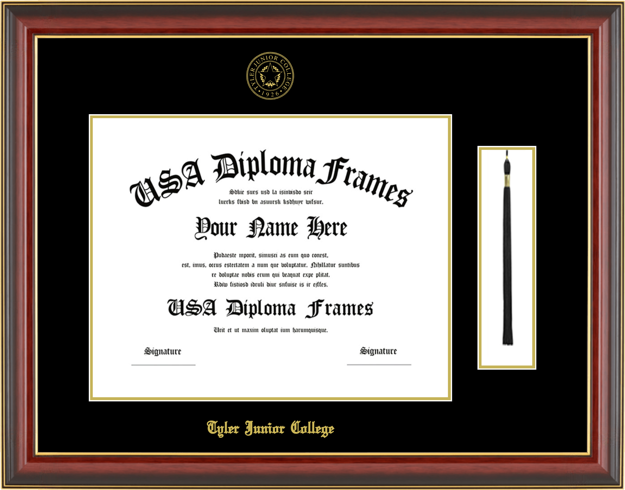 Tyler Junior College Diploma Frame with Tassel – Cherry Mahogany Gold Trim Glossy – Black and Gold Mat – 11 x 14