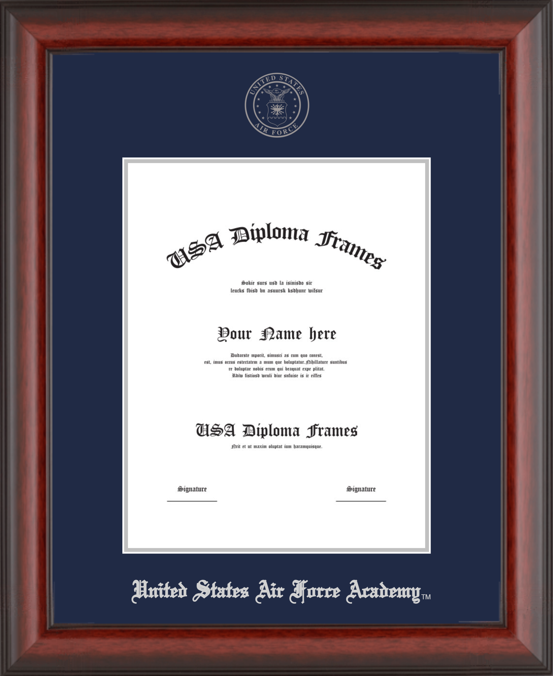 United States Air Force Academy – Single Vertical Document ( Bachelors ) – Cherry Mahogany Matte – Navy Mat – Silver Accent Mat – With Seal(University Seal Silver) – With Silver Embossing (United States Air Force Academy)