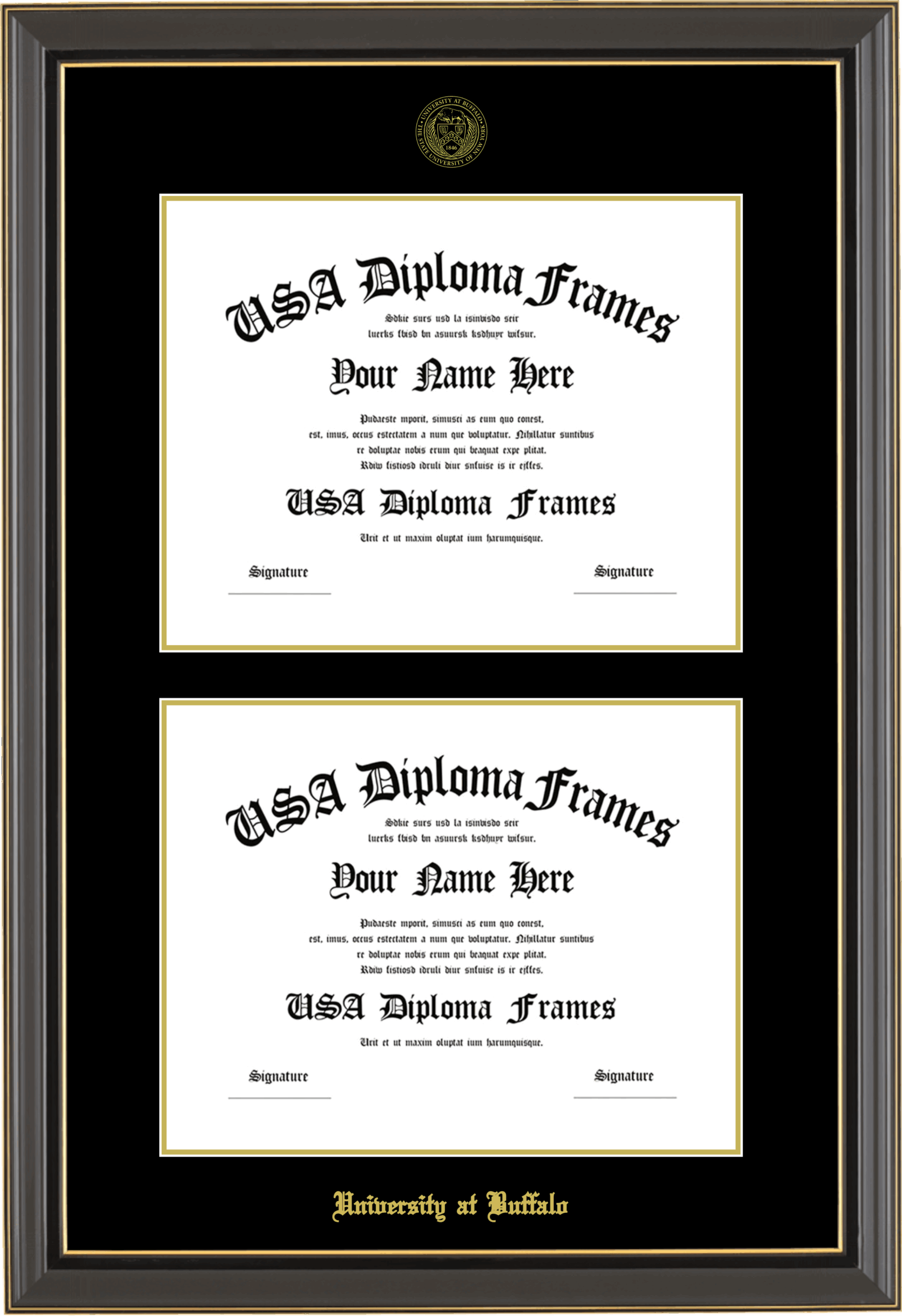 University at Buffalo, The State University of New York Double Diploma Frame – Double Document – Black Gold Trim Glossy – Black and Gold Mat