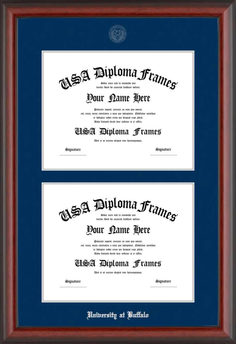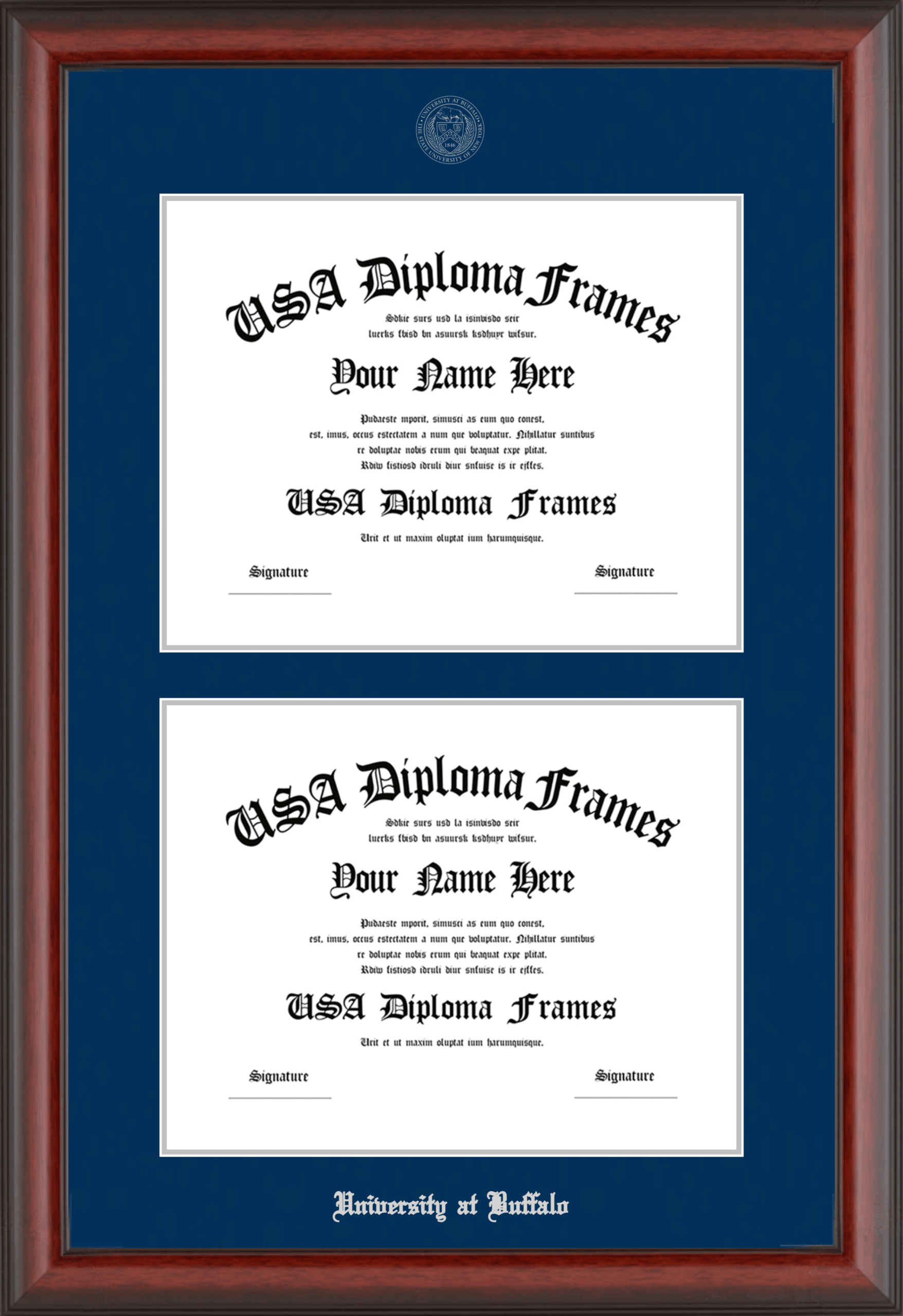 University at Buffalo, The State University of New York Double Diploma Frame – Double Document – Cherry Mahogany Matte – Navy and Silver Mat
