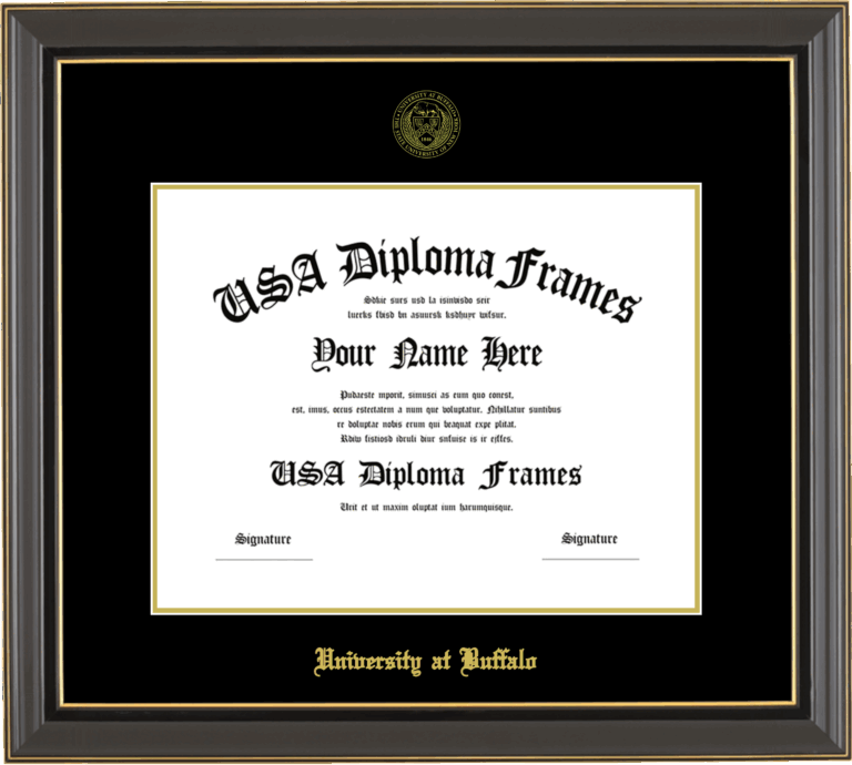 University at Buffalo Diploma Frame – Black Gold Trim Glossy – Black and Gold Mat