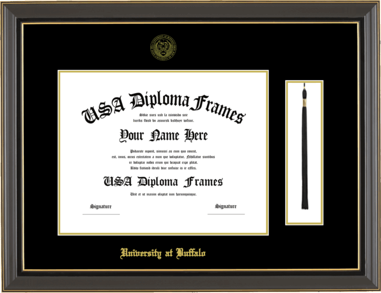 University at Buffalo Diploma Frame with Tassel – Black Gold Trim Glossy – Black and Gold Mat