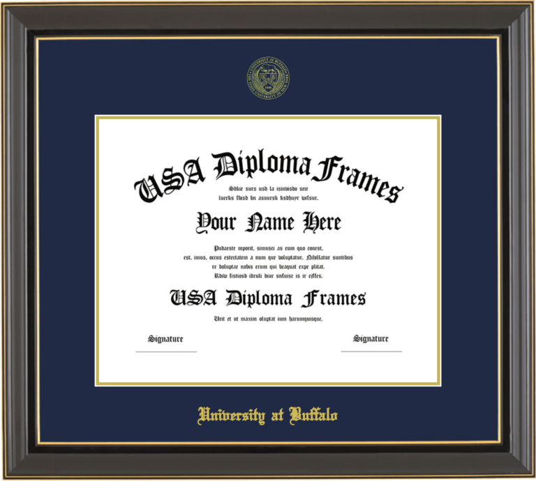 University at Buffalo, The State University of New York – Single Horizontal Document ( Diploma ) – Black Gold Trim Glossy – Navy Mat – Gold Accent Mat – With Seal(University Seal Gold) – With Gold Embossing (University at Buffalo)