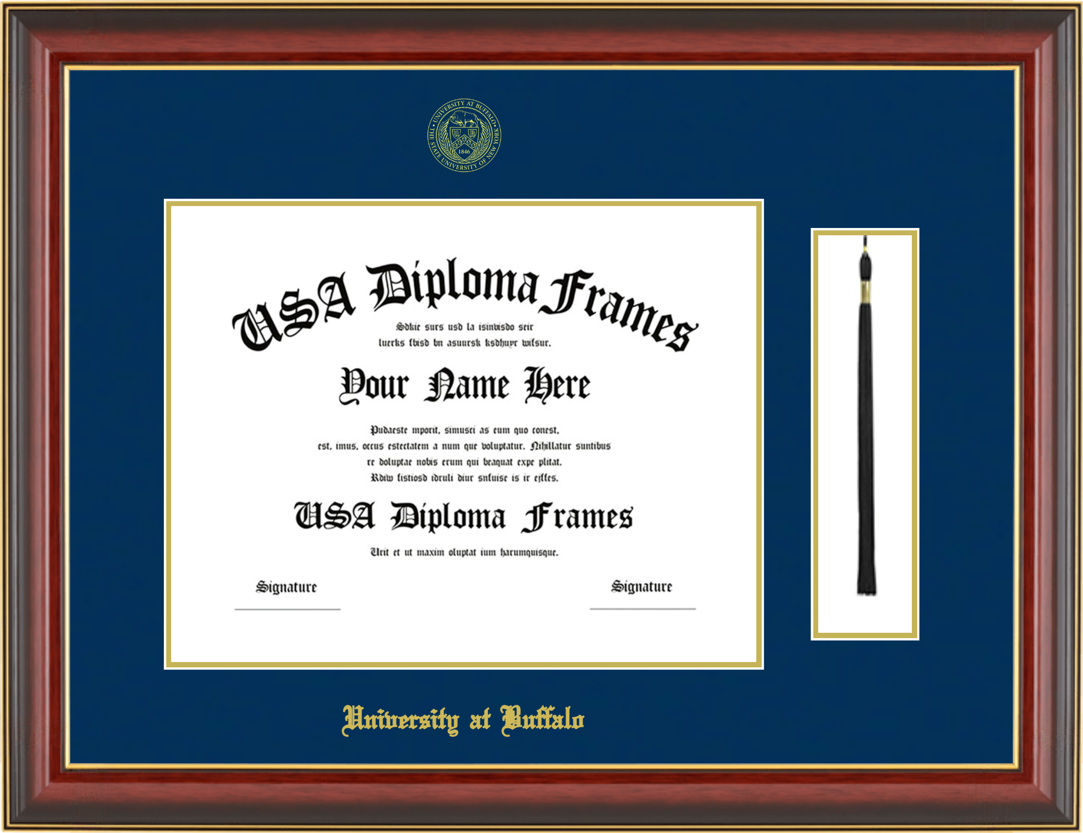 University at Buffalo Diploma Frame with Tassel – Cherry Mahogany Gold Trim Glossy – Navy and Gold Mat
