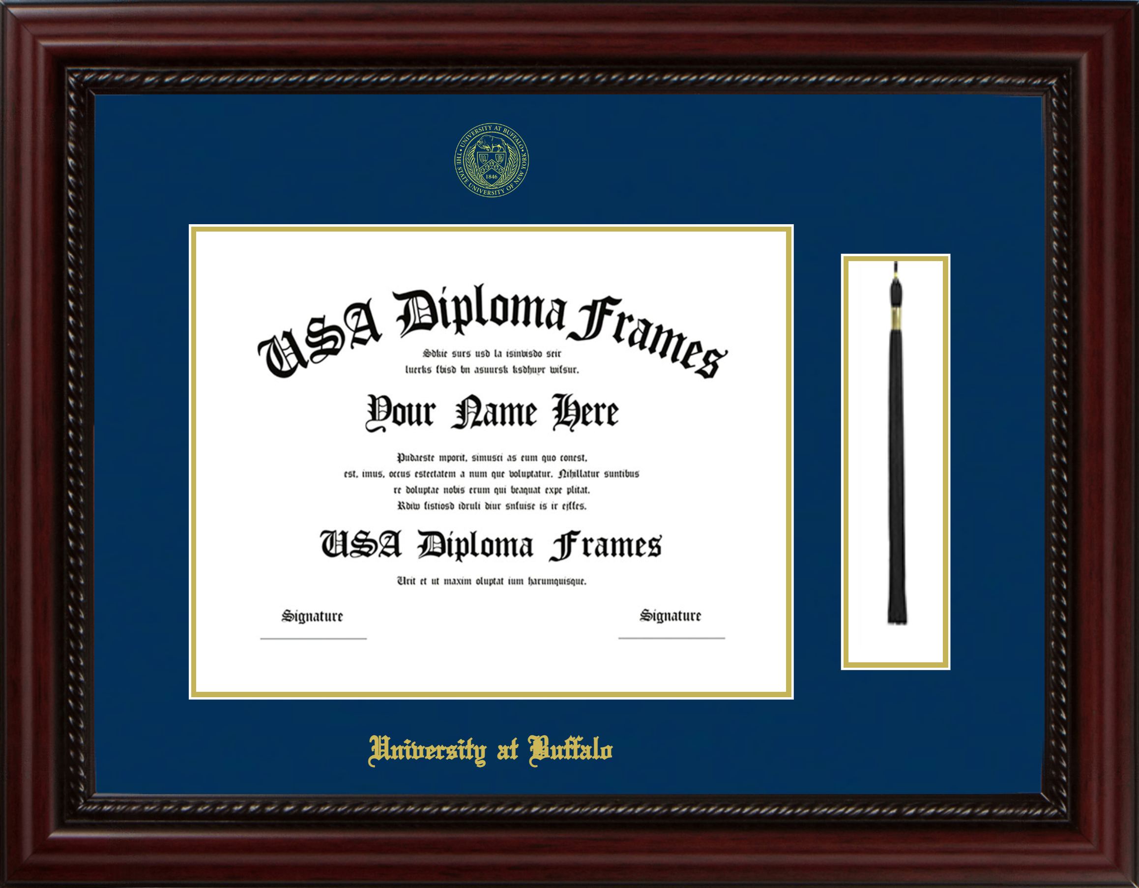 University at Buffalo Diploma Frame with Tassel – Executive Cherry Rope – Navy and Gold Mat