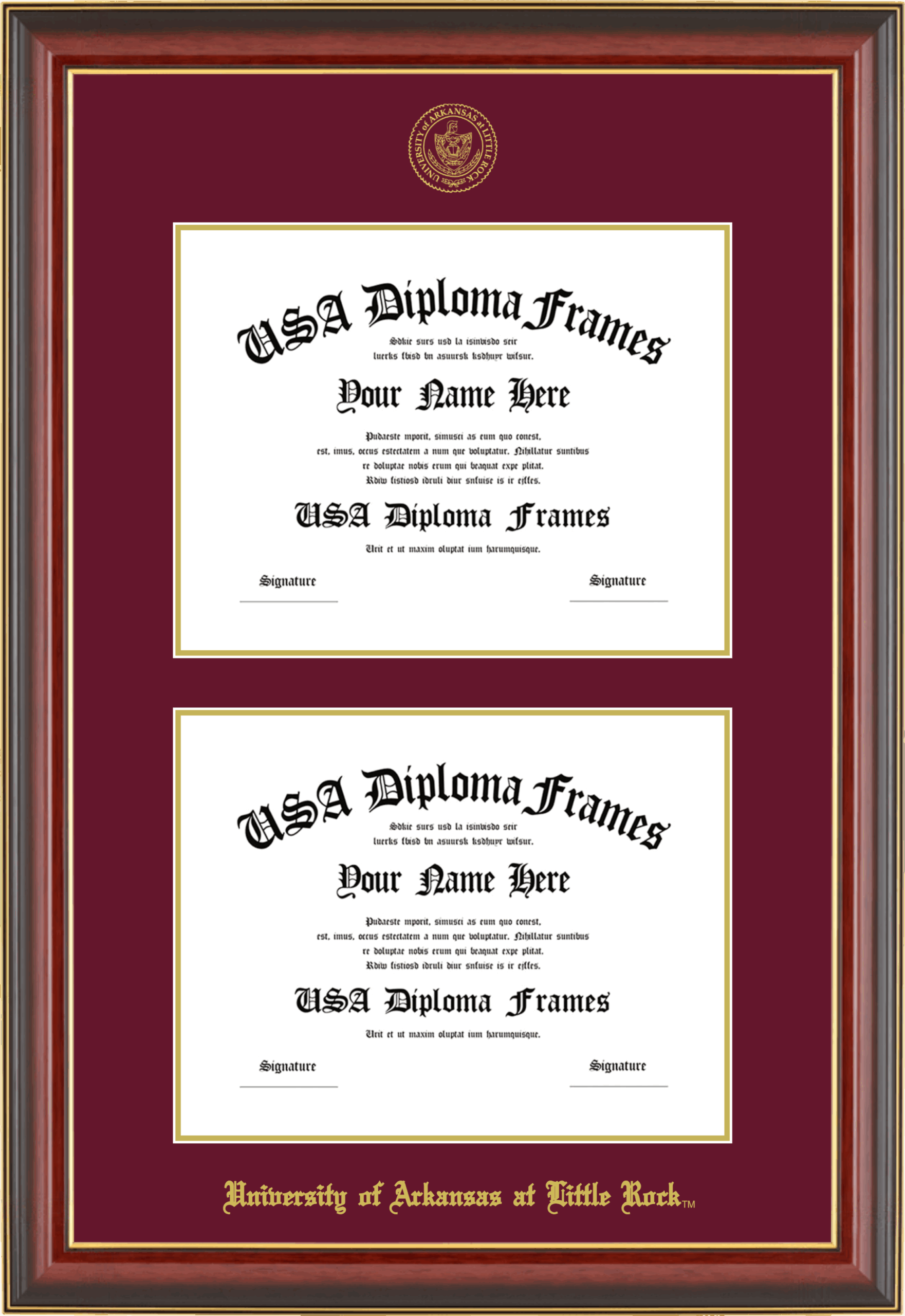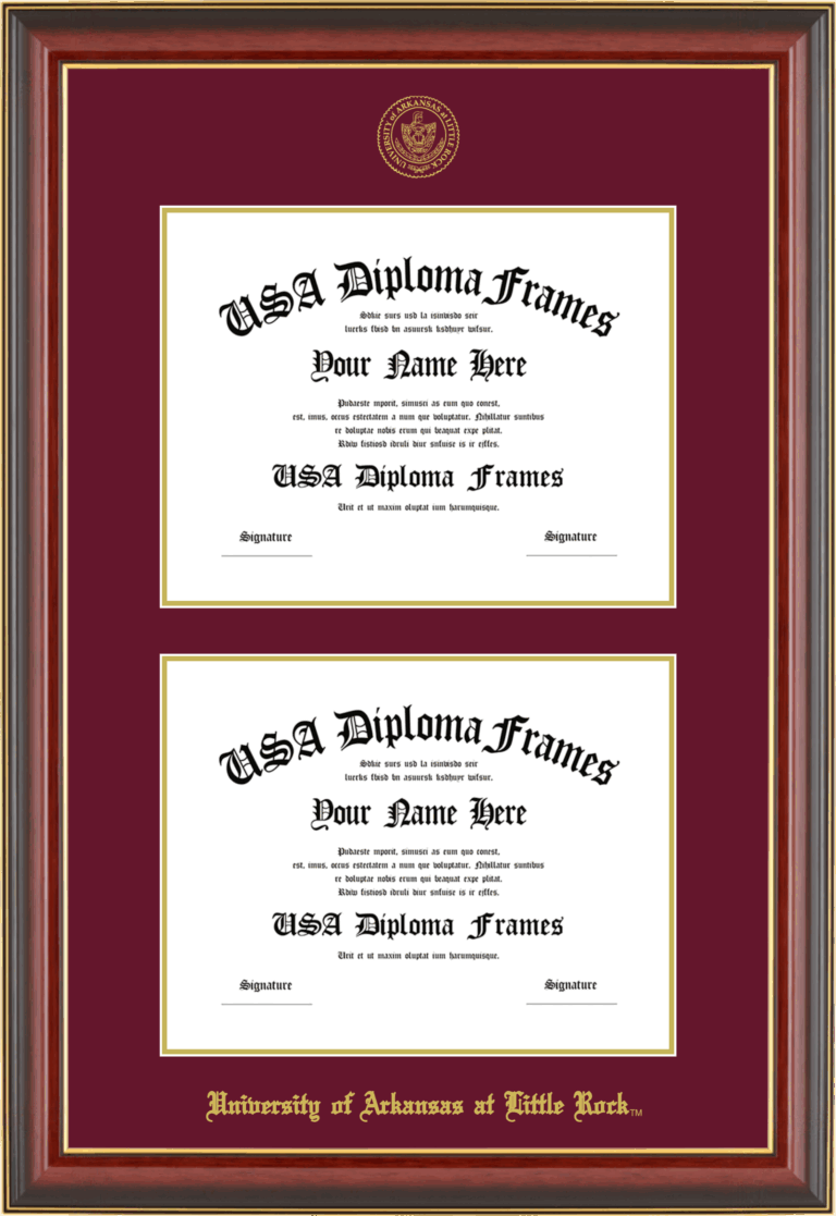 University of Arkansas at Little Rock Double Diploma Frame – Double Document – Cherry Mahogany Gold Trim Glossy – Maroon and Gold Mat