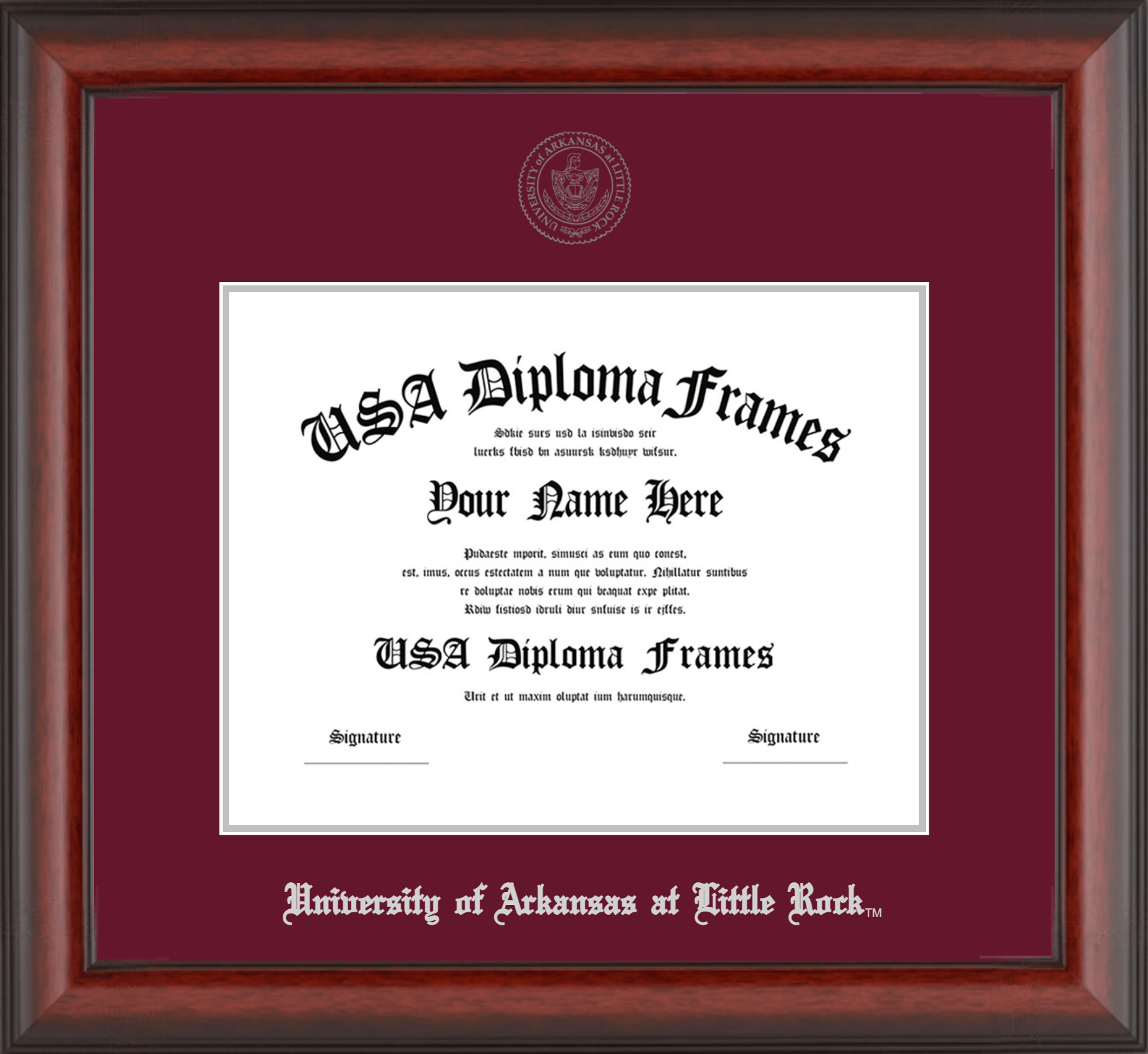 University of Arkansas at Little Rock – Single Horizontal Document ( Diploma ) – Cherry Mahogany Matte – Maroon Mat – Silver Accent Mat – With Seal(University Seal Silver) – With Silver Embossing (University of Arkansas at Little Rock)