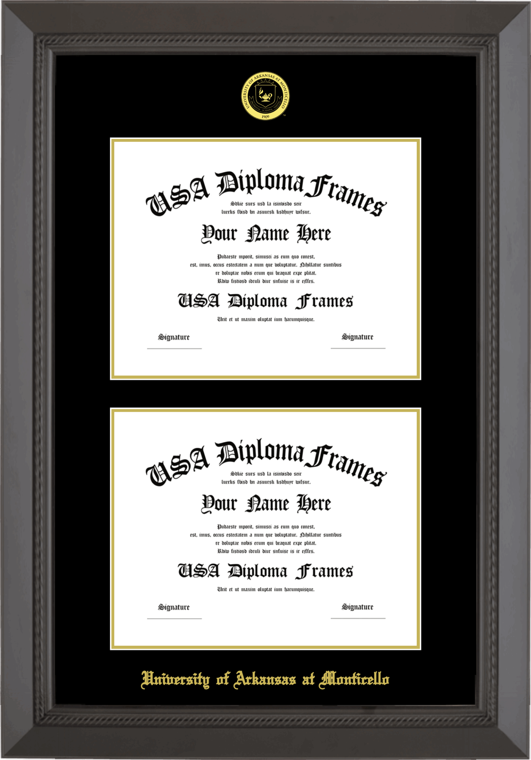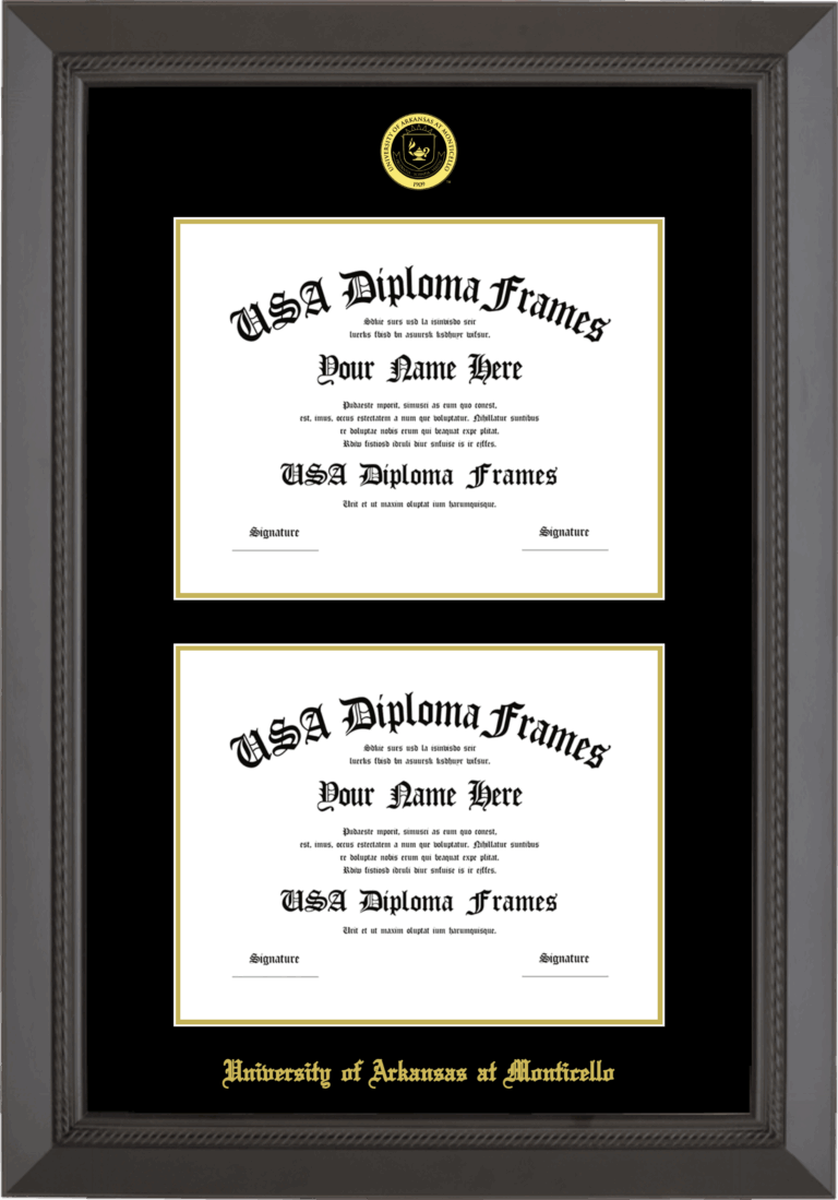 University of Arkansas at Monticello Double Diploma Frame – Double Document – Black Rope – Black and Gold Mat