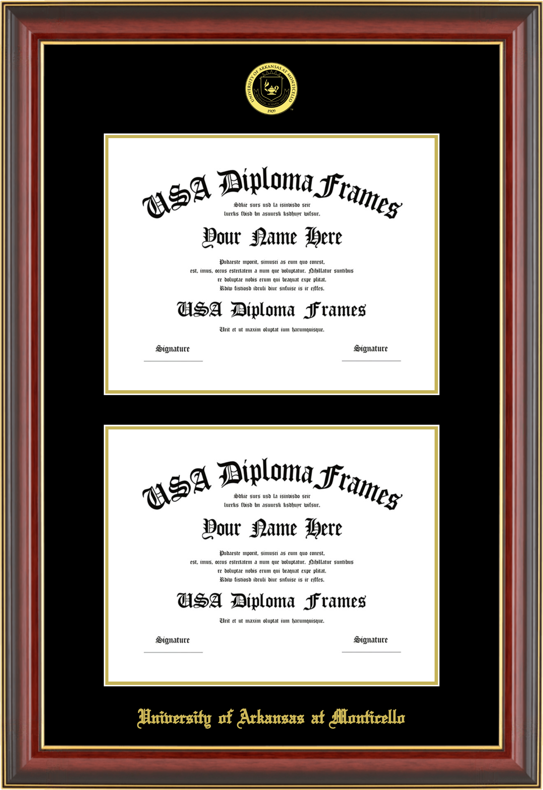 University of Arkansas at Monticello Double Diploma Frame – Double Document – Cherry Mahogany Gold Trim Glossy – Black and Gold Mat