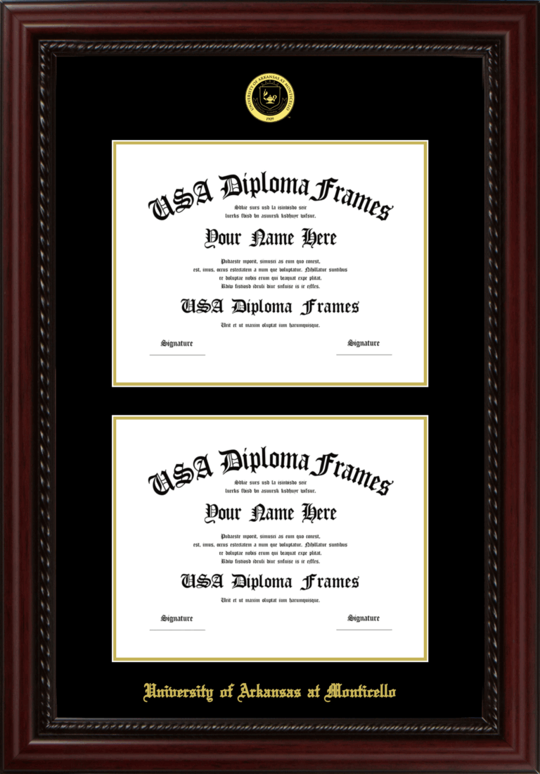 University of Arkansas at Monticello Double Diploma Frame – Double Document – Executive Cherry Rope – Black and Gold Mat