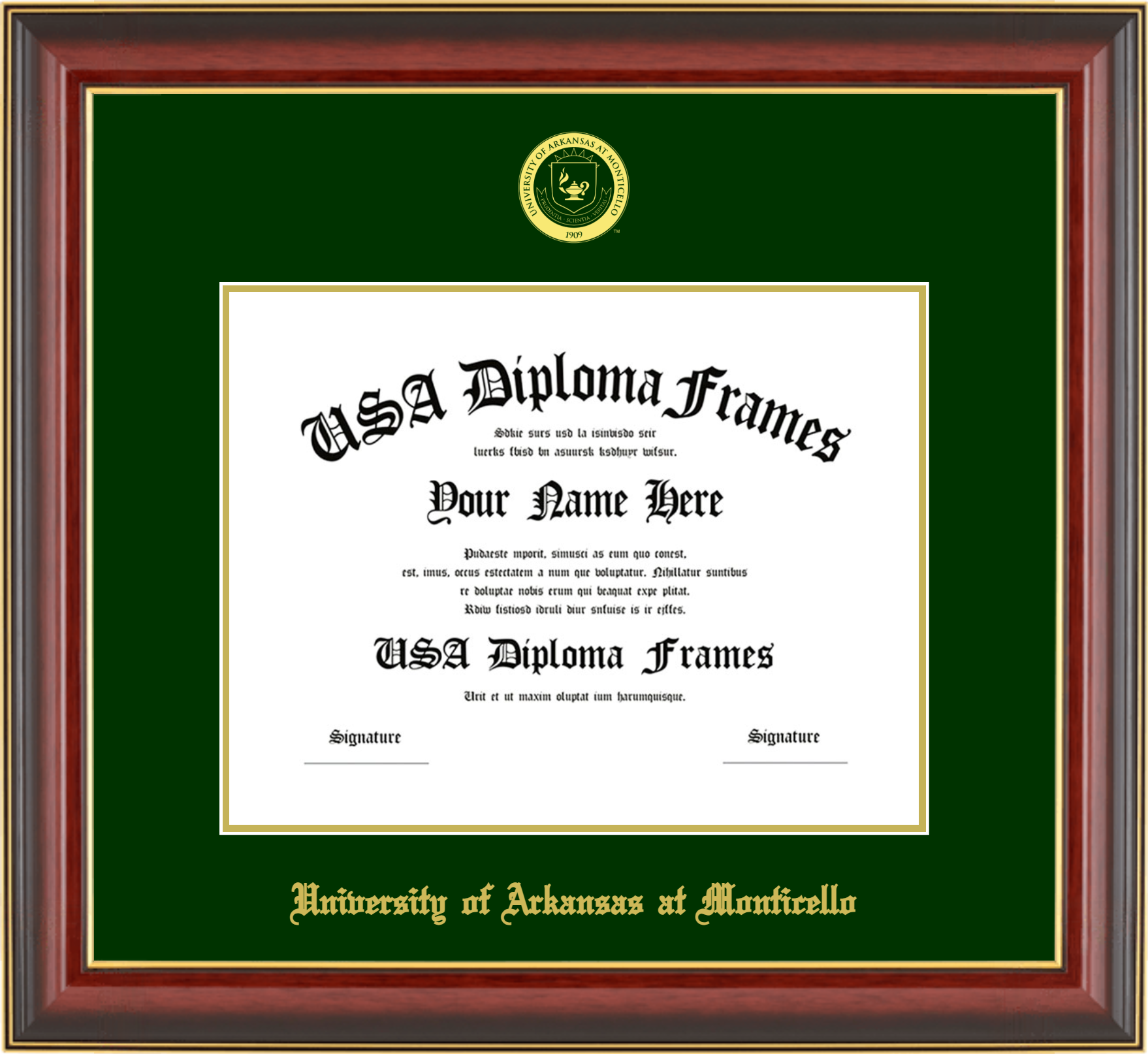 University of Arkansas at Monticello Diploma Frame – Cherry Mahogany Gold Trim Glossy – Winter Green and Gold Mat