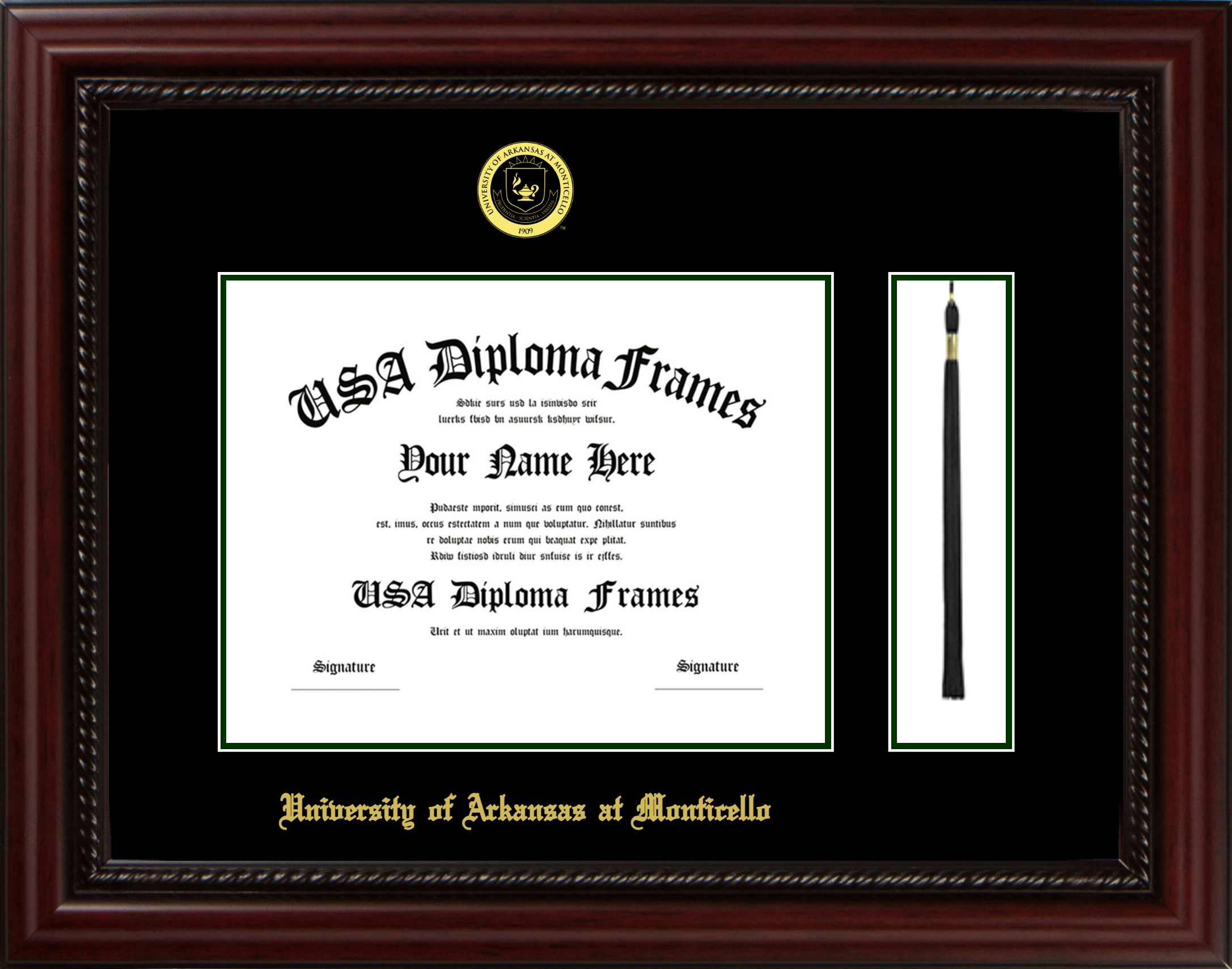University of Arkansas at Monticello Diploma Frame with Tassel – Executive Cherry Rope – Black and Winter Green Mat