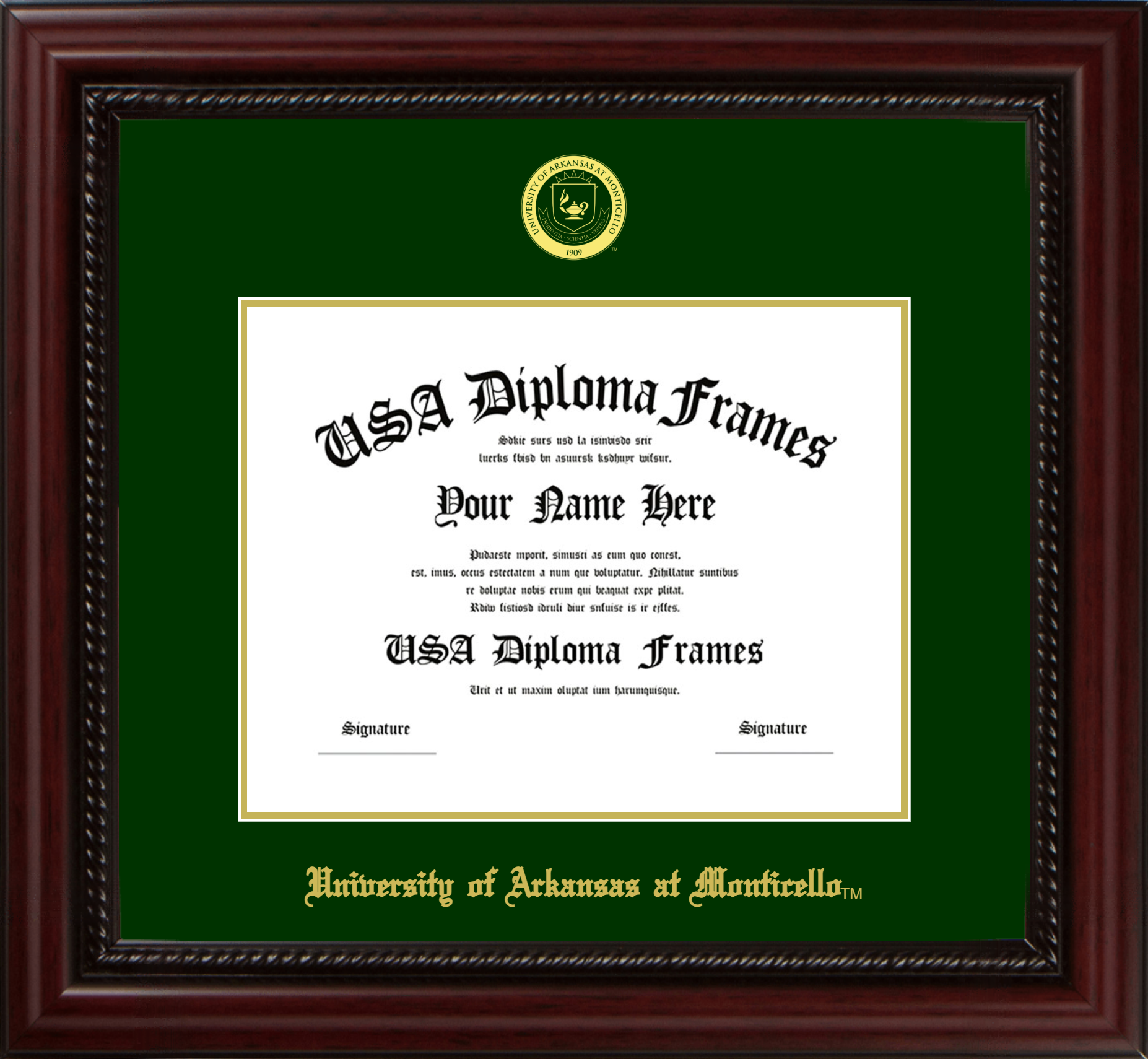 University of Arkansas at Monticello – Single Horizontal Document ( Diploma ) – Executive Cherry Rope – Winter Green Mat – Gold Accent Mat – With Seal(University Seal Gold) – With Gold Embossing (University of Arkansas at Monticello)