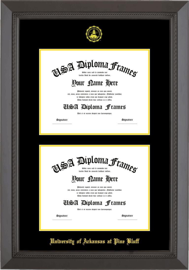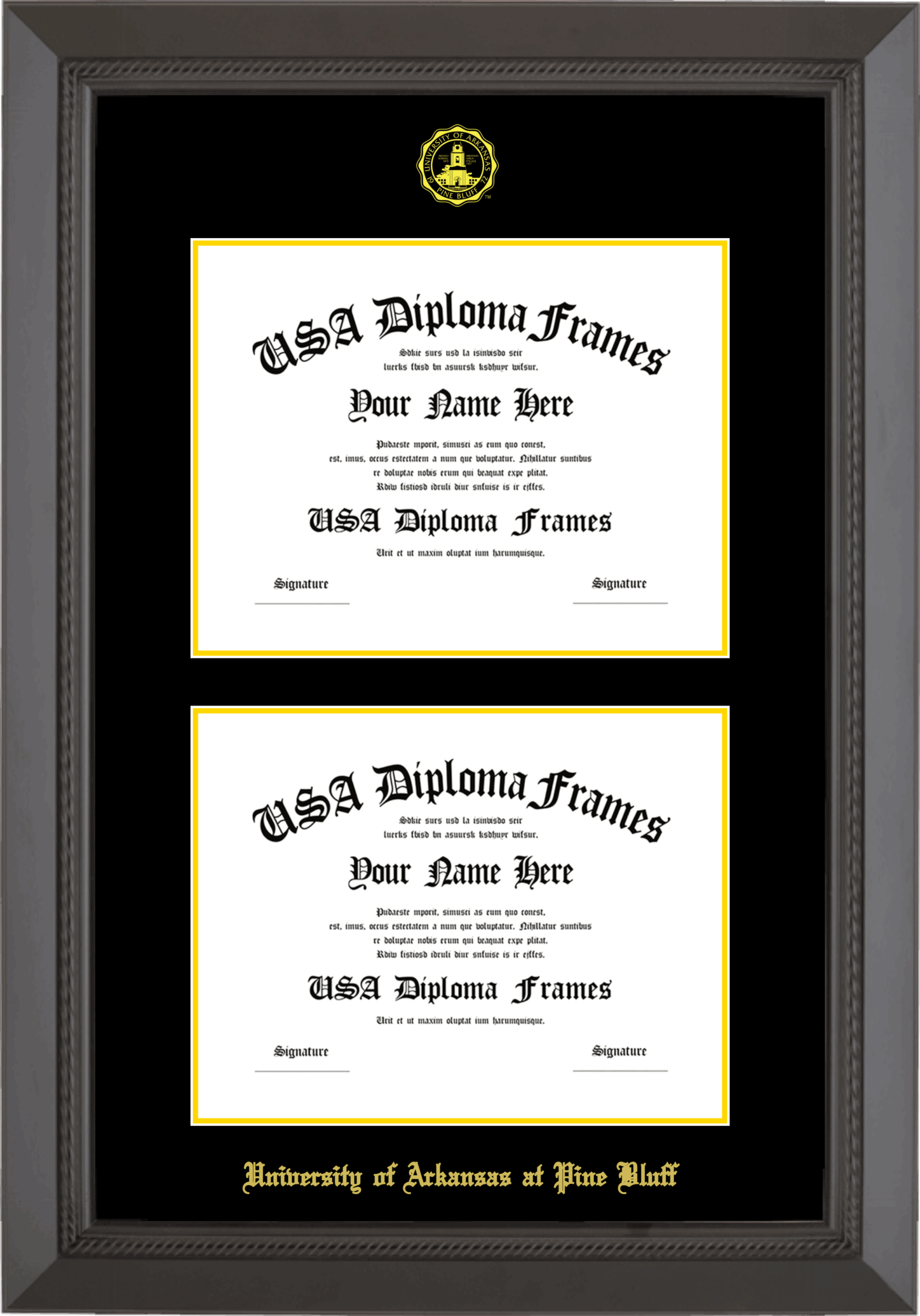 University of Arkansas at Pine Bluff Double Diploma Frame – Double Document – Black Rope – Black and Yellow Gold Mat