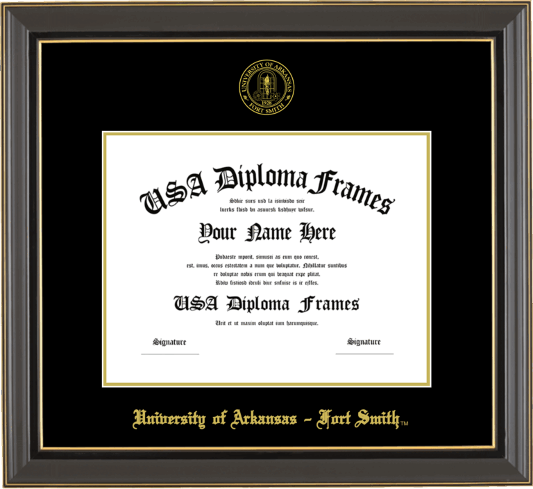 University of Arkansas – Fort Smith – Single Horizontal Document ( Diploma ) – Black Gold Trim Glossy – Black Mat – Gold Accent Mat – With Seal(University Seal Gold) – With Gold Embossing (University of Arkansas – Fort Smith)