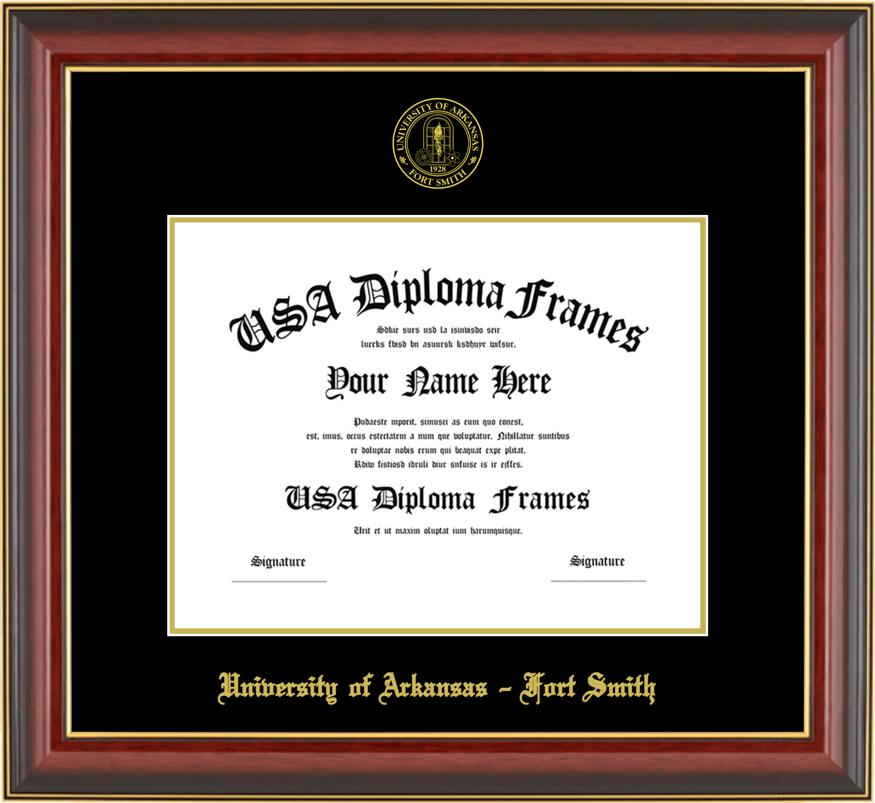 University of Arkansas – Fort Smith – Single Horizontal Document ( Diploma ) – Cherry Mahogany Gold Trim Glossy – Black Mat – Gold Accent Mat – With Seal(University Seal Gold) – With Gold Embossing (University of Arkansas – Fort Smith)