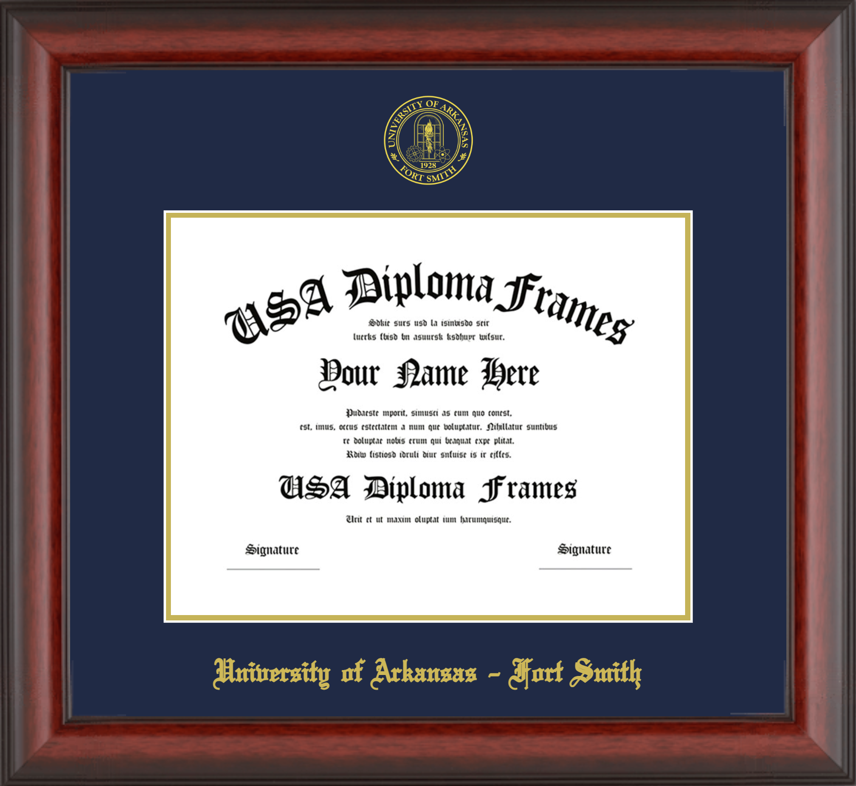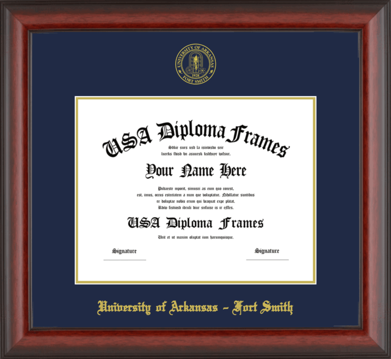 University of Arkansas – Fort Smith – Single Horizontal Document ( Diploma ) – Cherry Mahogany Matte – Navy Mat – Gold Accent Mat – With Seal(University Seal Gold) – With Gold Embossing (University of Arkansas – Fort Smith)