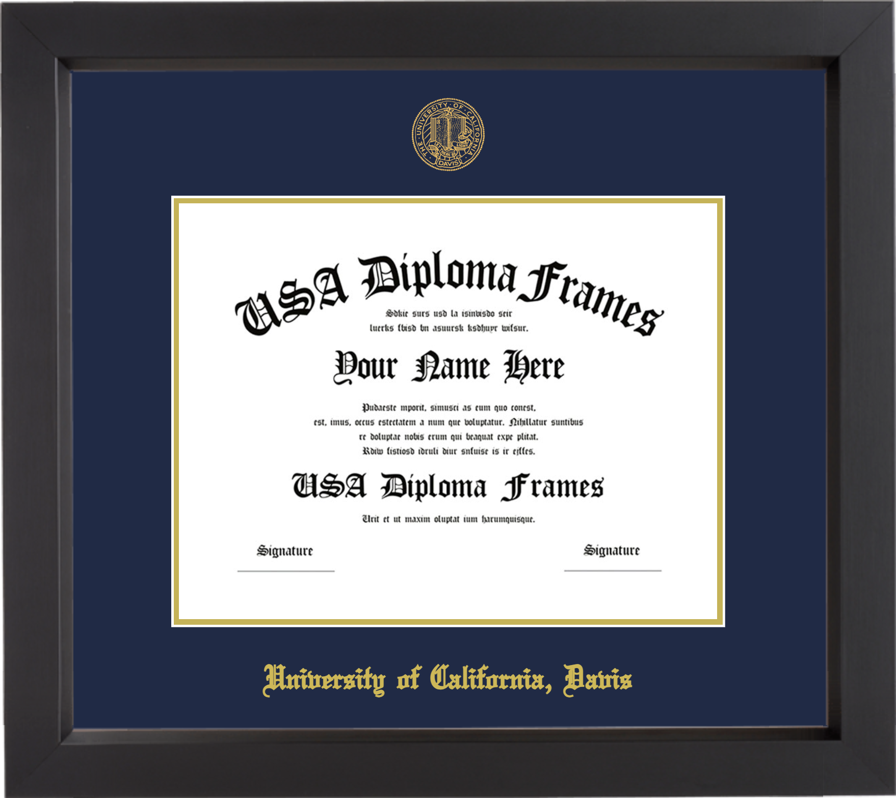 University of California, Davis – Single Horizontal Document ( Diploma ) – Black Matte – Navy Mat – Gold Accent Mat – With Seal(University Seal Gold) – With Gold Embossing (University of California, Davis)