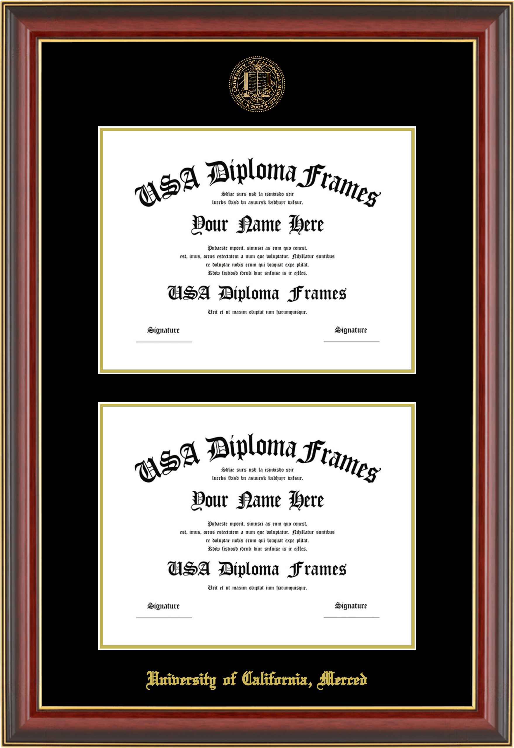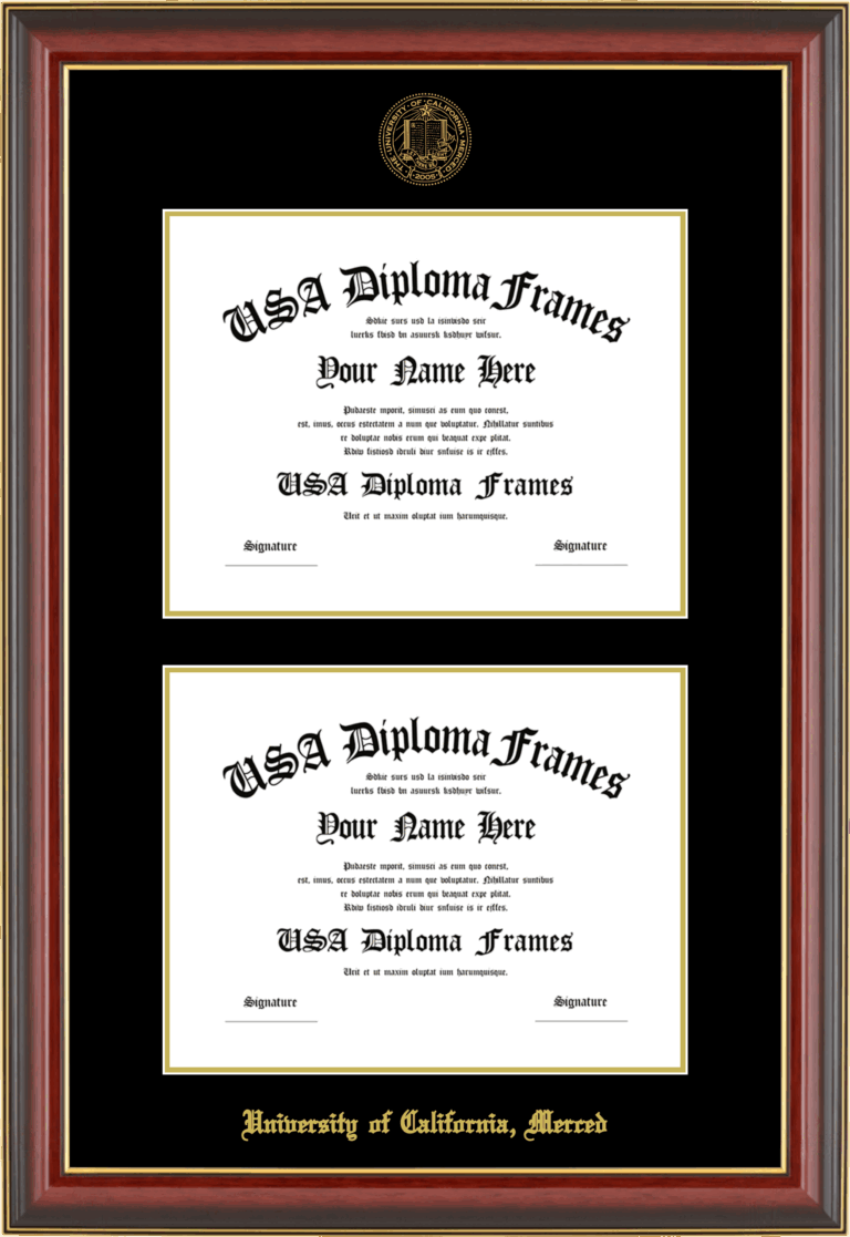 University of California, Merced Double Diploma Frame – Double Document – Cherry Mahogany Gold Trim Glossy – Black and Gold Mat