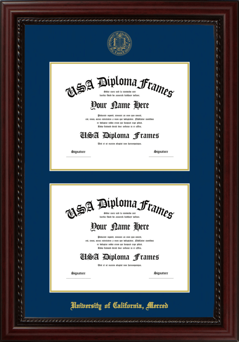 University of California, Merced Double Diploma Frame – Double Document – Executive Cherry Rope – Navy and Gold Mat