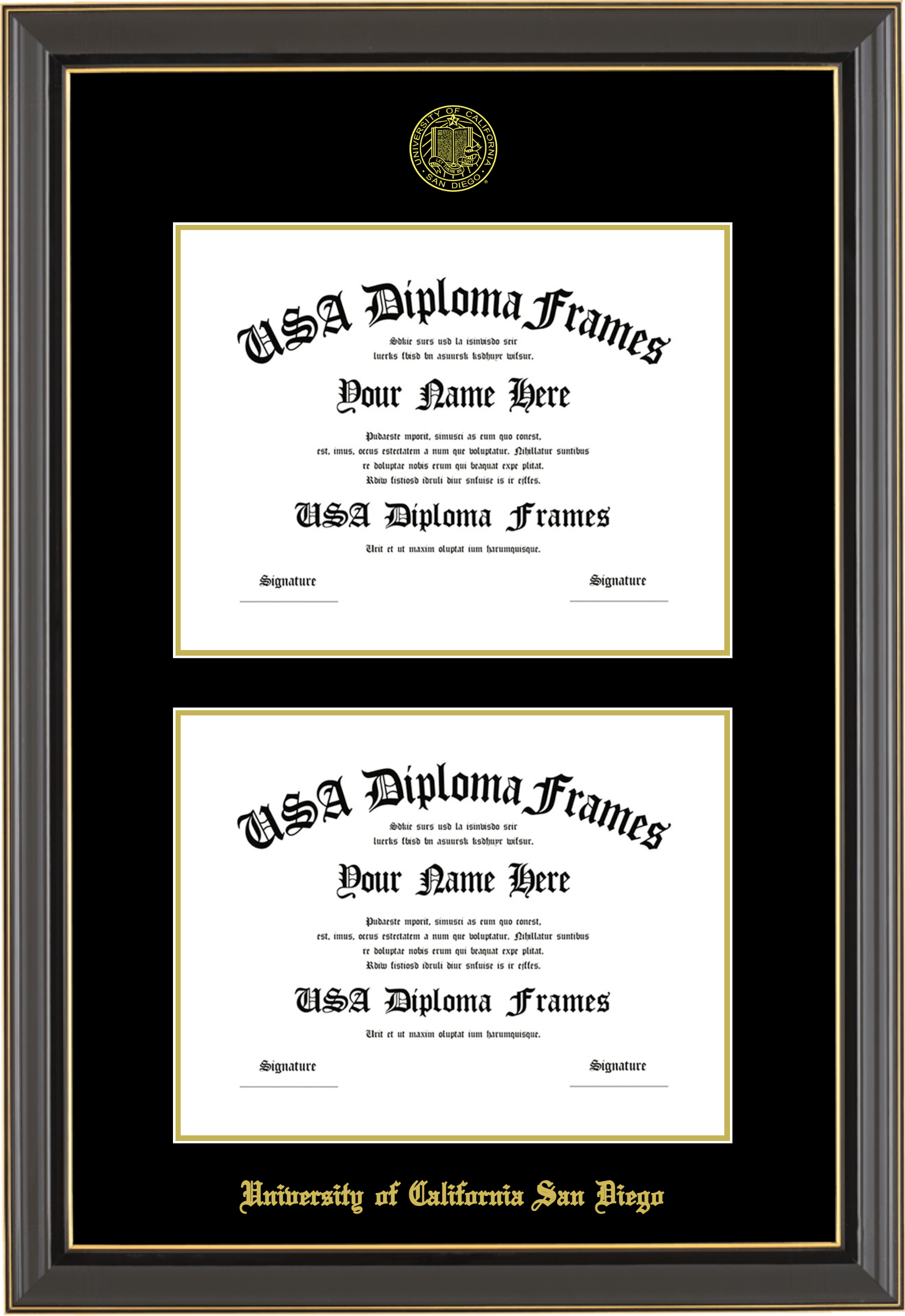 University of California San Diego Double Diploma Frame – Double Document – Black Gold Trim Glossy – Black and Gold Mat