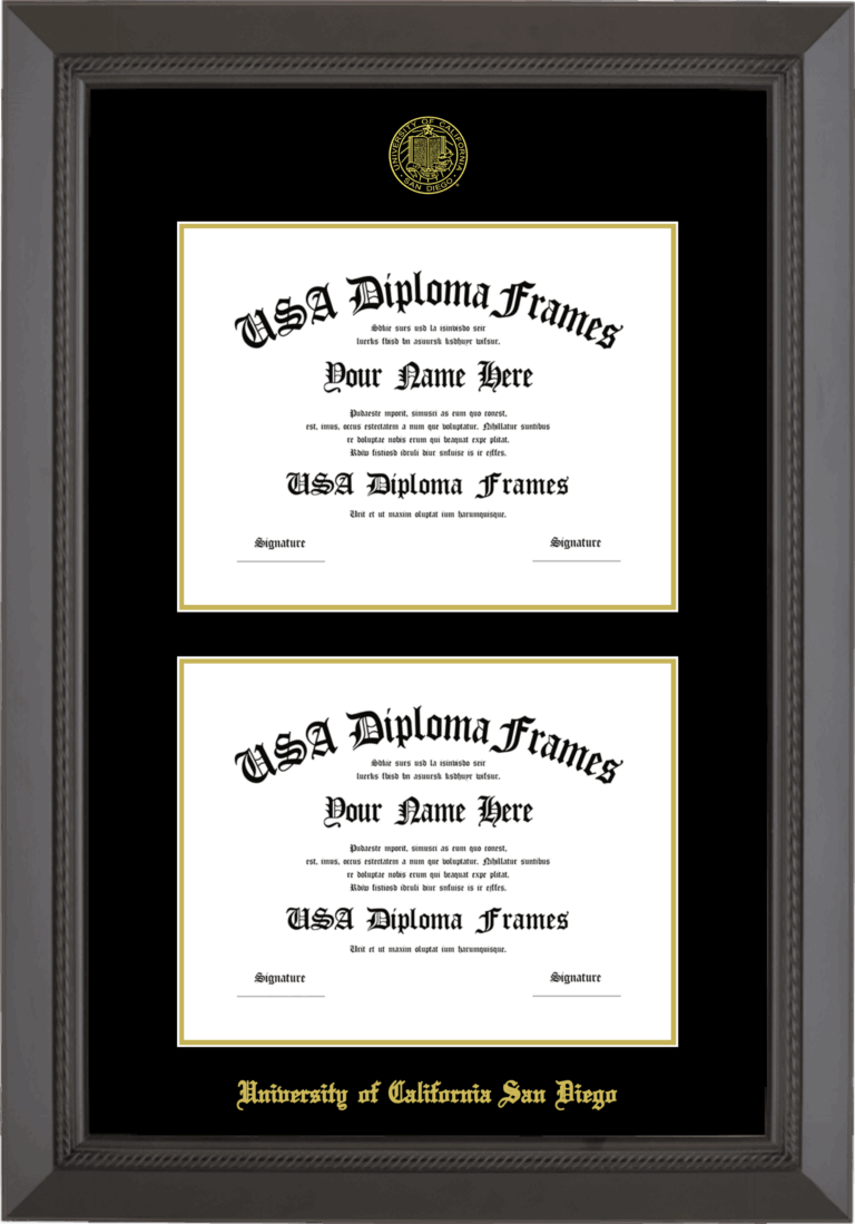 University of California San Diego Double Diploma Frame – Double Document – Black Rope – Black and Gold Mat