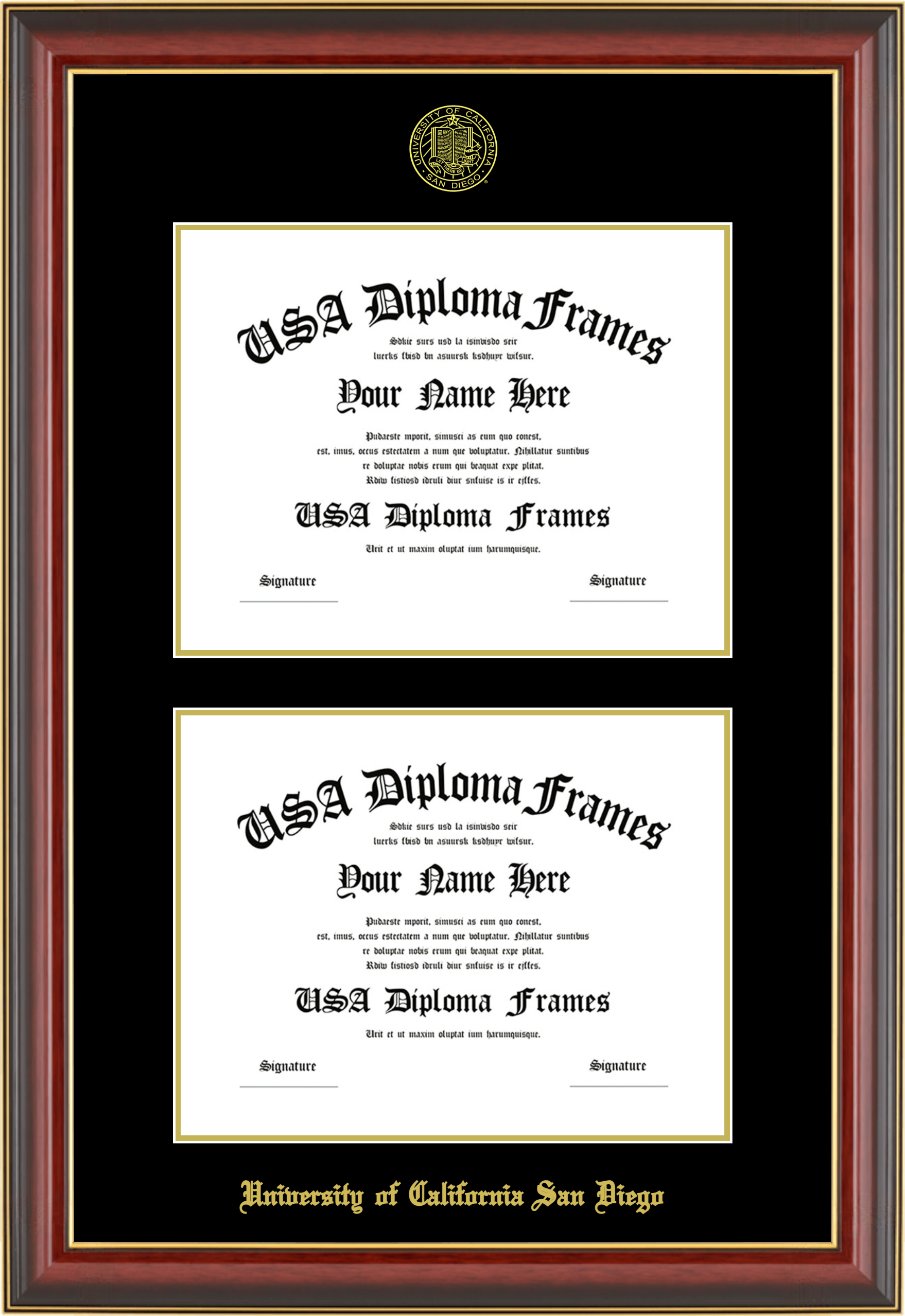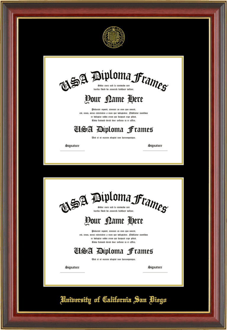 University of California San Diego Double Diploma Frame – Double Document – Cherry Mahogany Gold Trim Glossy – Black and Gold Mat