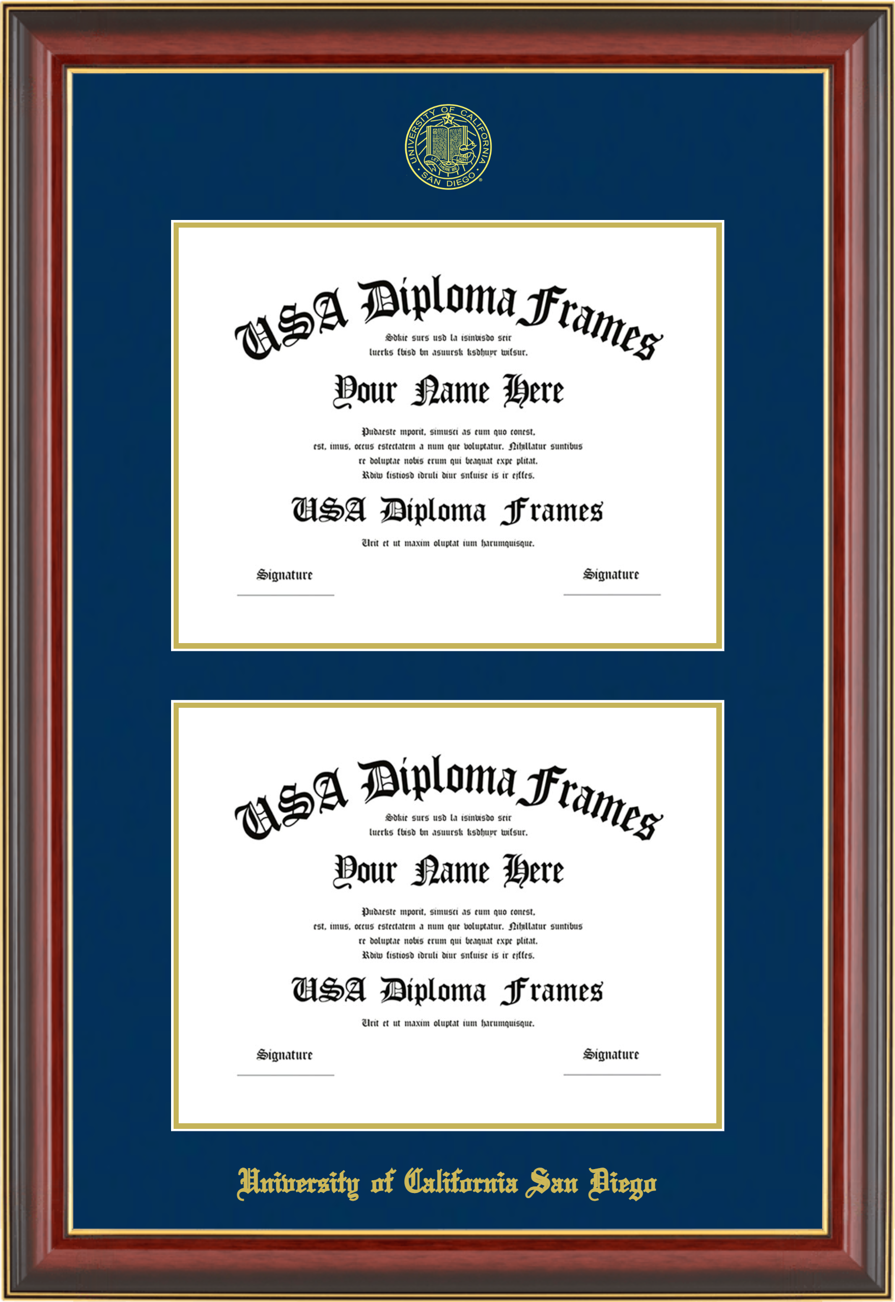 University of California San Diego Double Diploma Frame – Double Document – Cherry Mahogany Gold Trim Glossy – Navy and Gold Mat