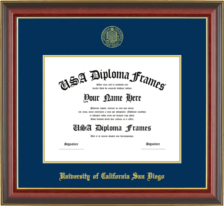 University of California San Diego Diploma Frame – Cherry Mahogany Gold Trim Glossy – Navy and Gold Mat