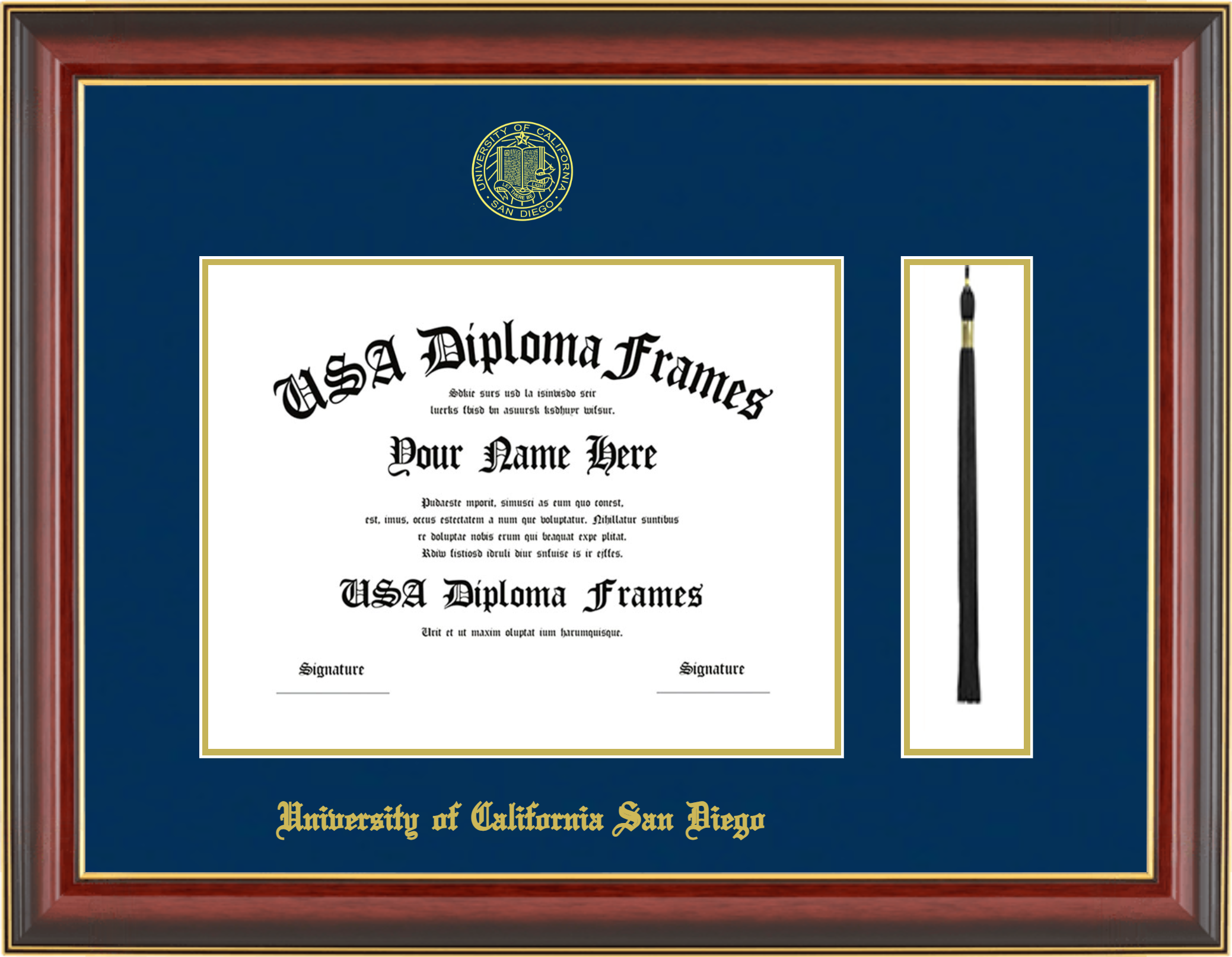 University of California San Diego Diploma Frame with Tassel – Cherry Mahogany Gold Trim Glossy – Navy and Gold Mat
