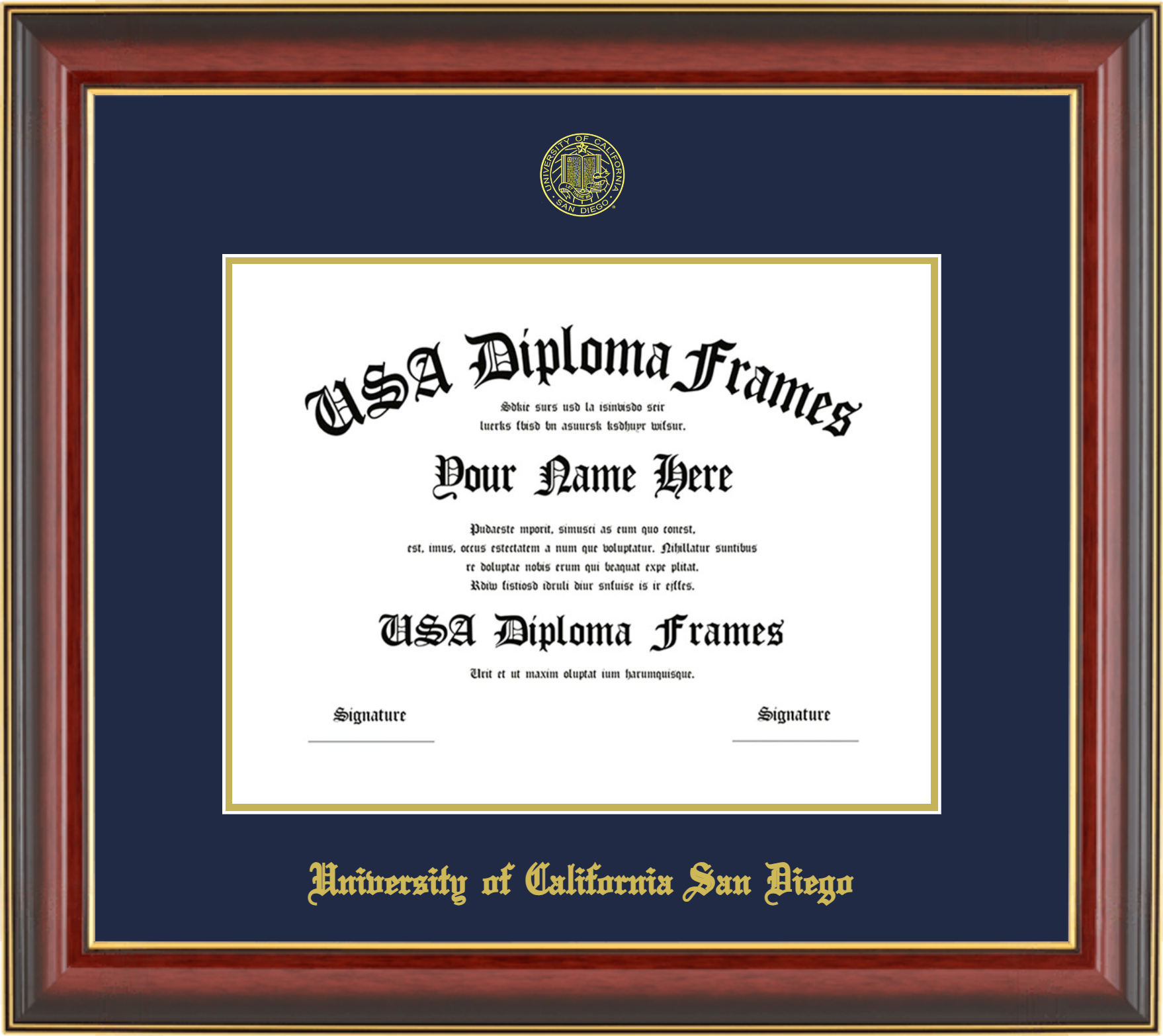 University of California San Diego – Single Horizontal Document ( Diploma ) – Cherry Mahogany Gold Trim Glossy – Navy Mat – Gold Accent Mat – With Seal(University Seal Gold) – With Gold Embossing (University of California San Diego)