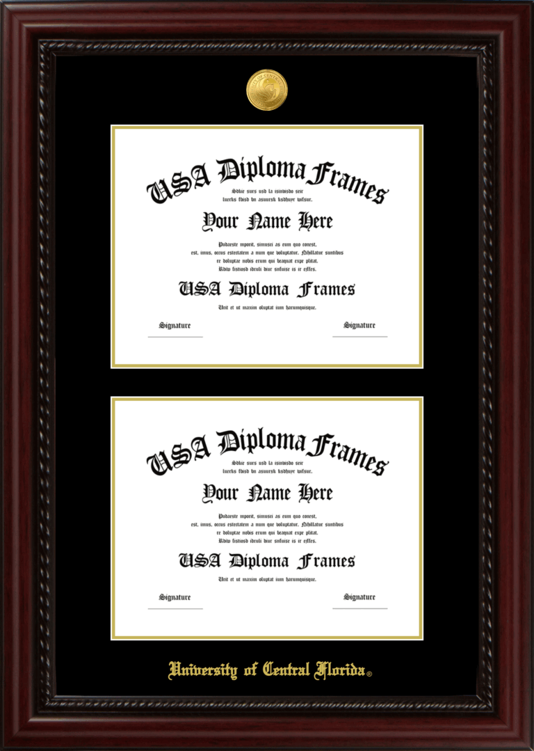 University of Central Florida Double Diploma Frame – Double Document Frame for 8.5″x11″ Bachelor’s Degrees – Executive Cherry Rope – Black and Gold Mat with Medallion Seal