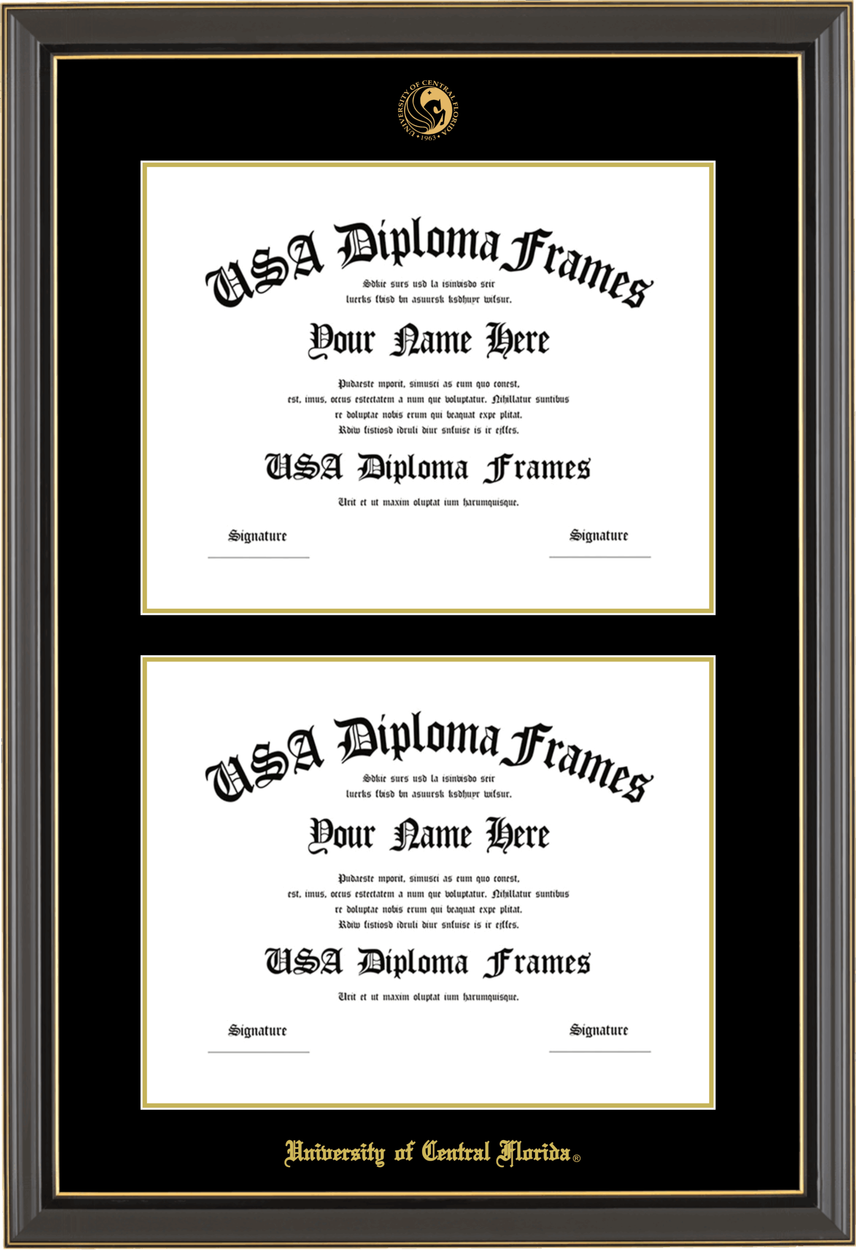 University of Central Florida Double Diploma Frame – Double Document Frame for 11″x14″ Master’s and PhD/Doctoral Degrees – Black Gold Trim Glossy – Black and Gold Mat