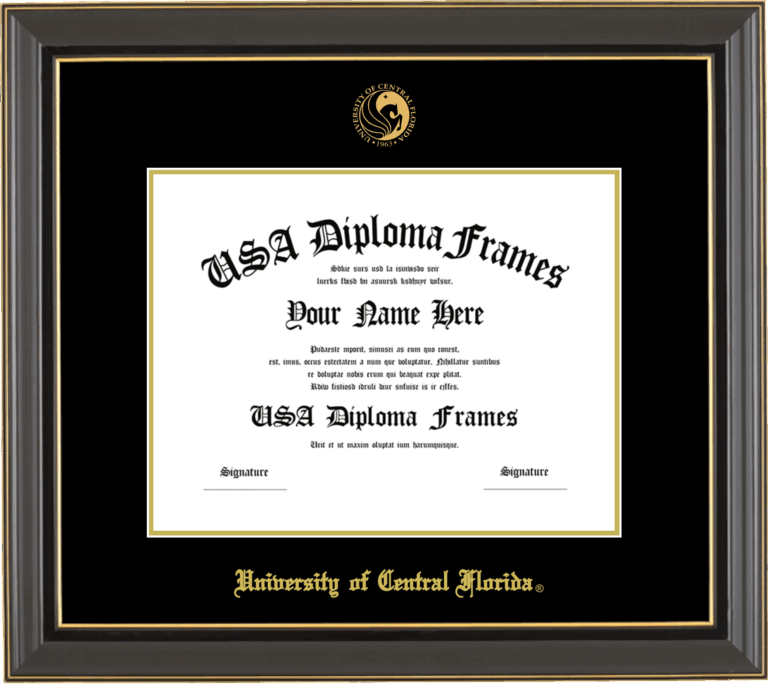 University of Central Florida Diploma Frame – For 8.5″x11″ Bachelor’s Degrees – Black Gold Trim Glossy – Black Gold Mat with Seal