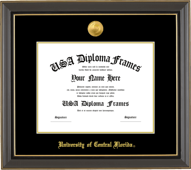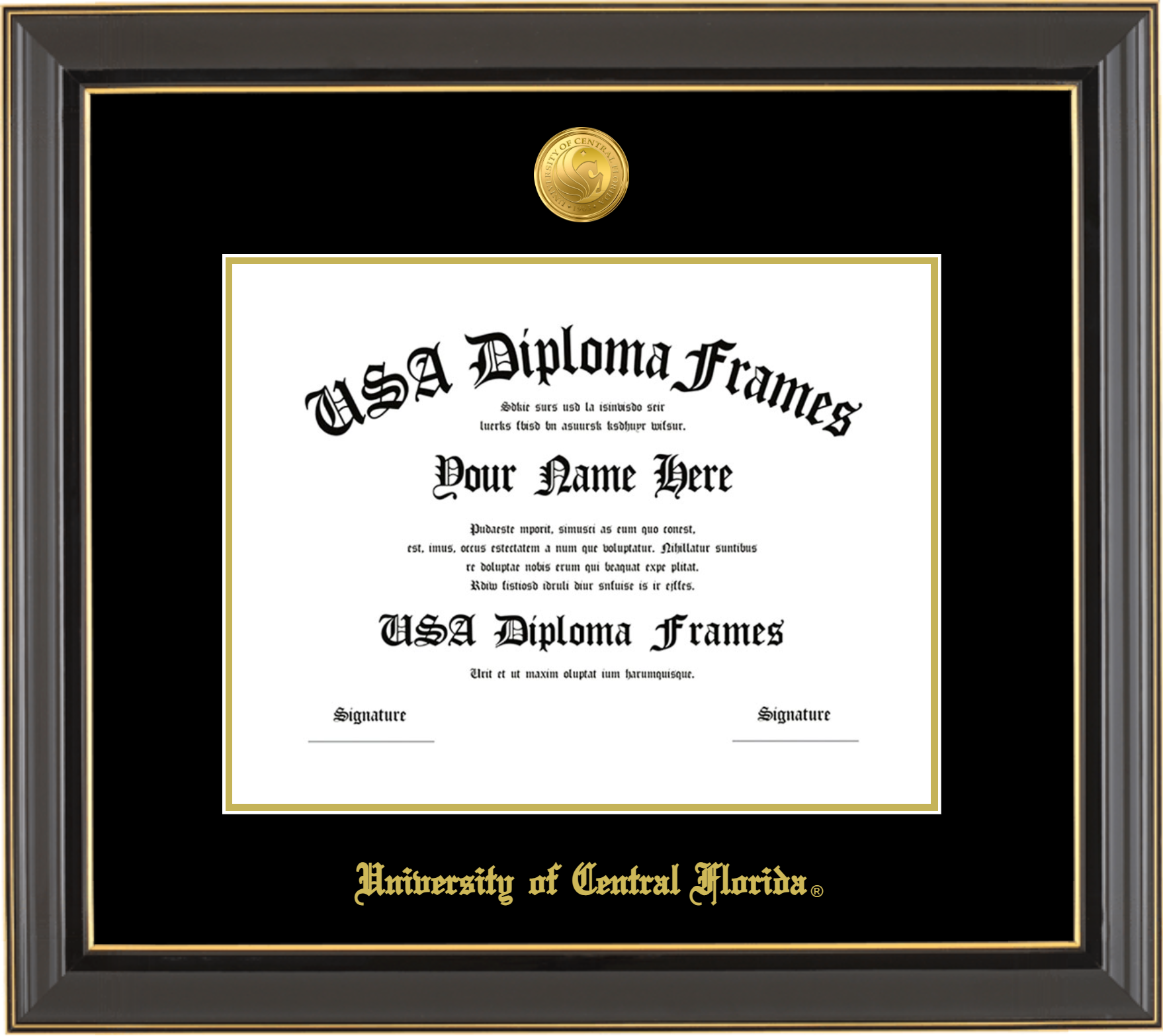University of Central Florida Diploma Frame – For 8.5″x11″ Bachelor’s Degrees – Black Gold Trim Glossy – Black Gold Mat with Medallion Seal