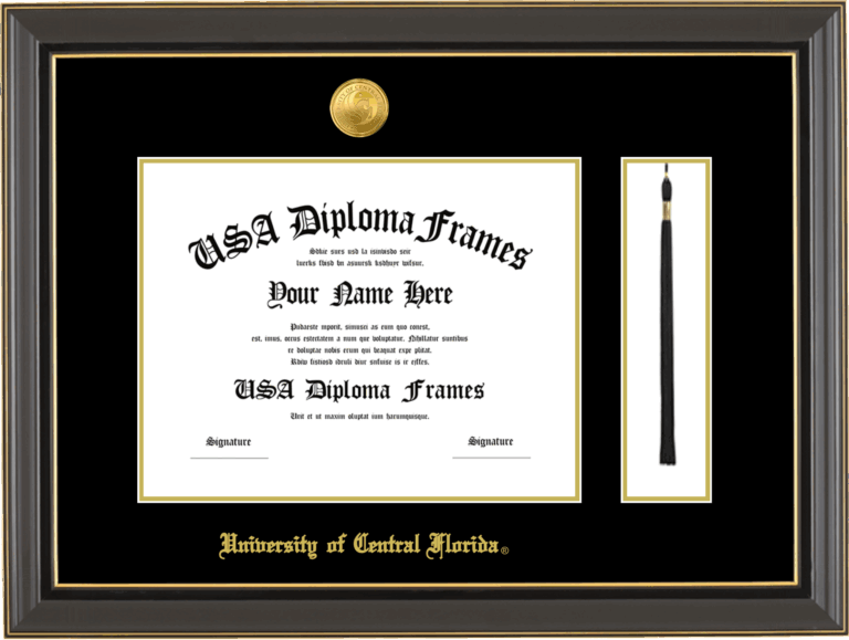 University of Central Florida Diploma Frame with Tassel – For 8.5″x11″ Bachelor’s Degrees – Black Gold Trim Gossy – Black Gold Mat with Medallion Seal